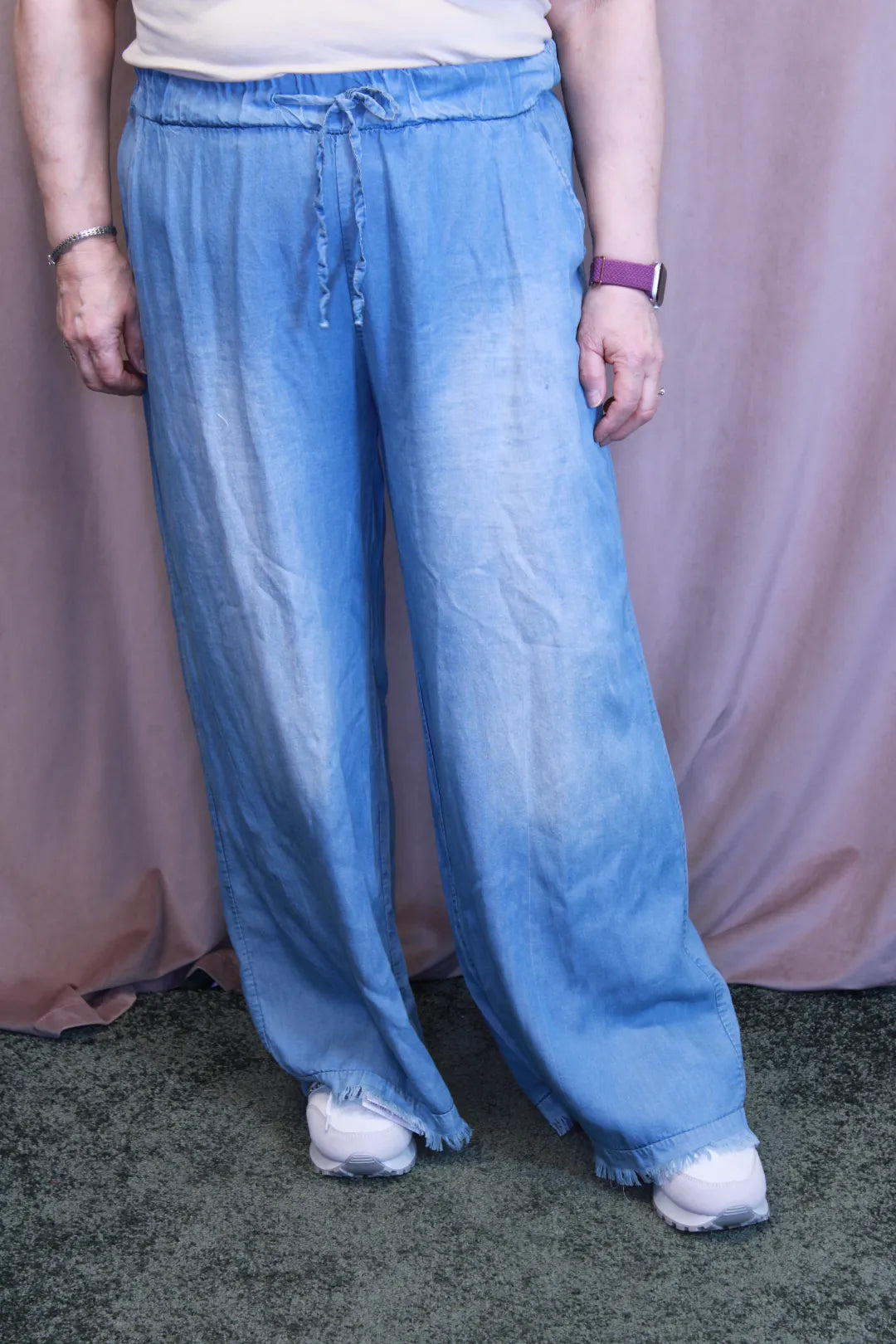 Leveälahkeiset housut kuminauhalla