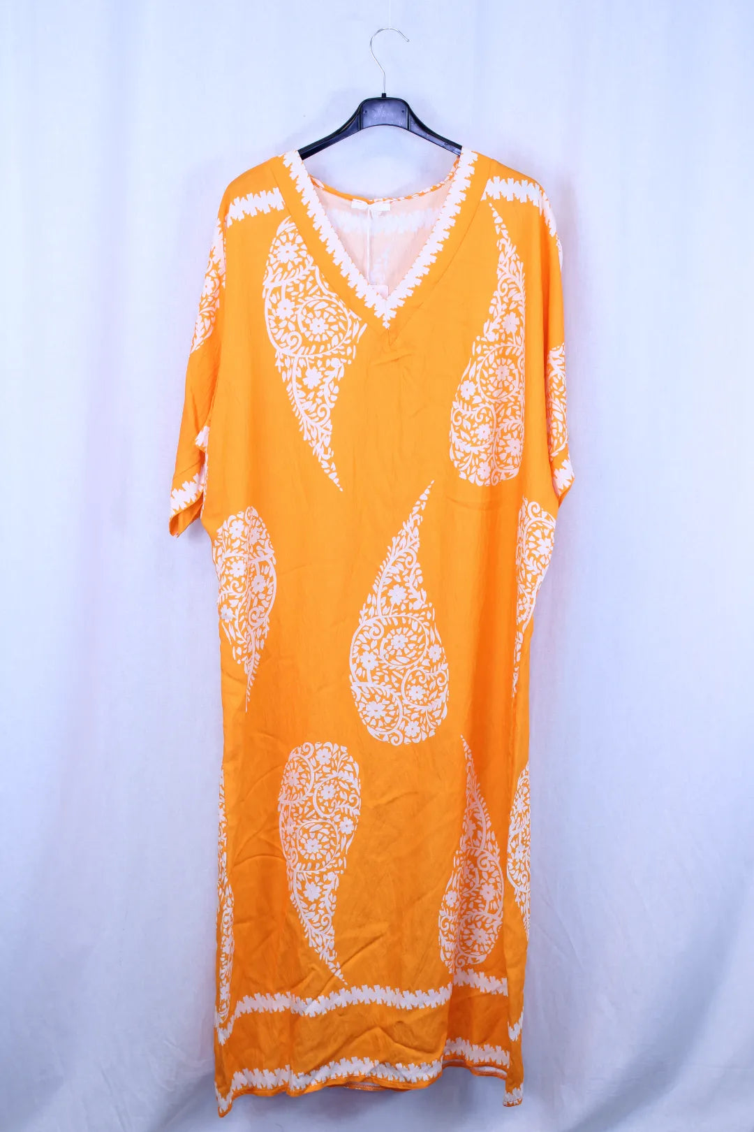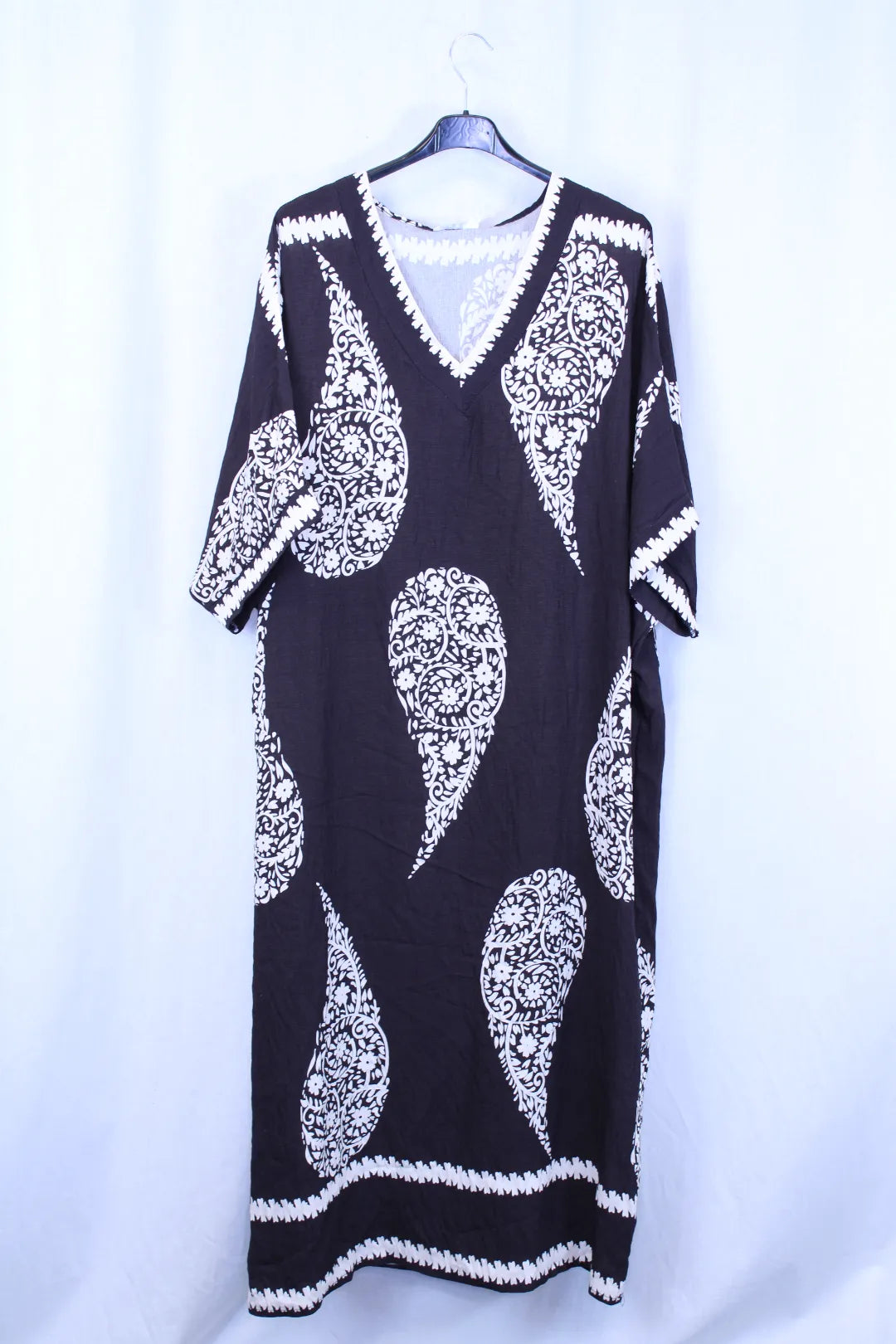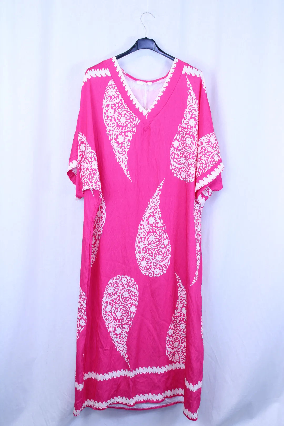 Kaunis pitkä mekko suoralla mallilla ja lyhyellä hihalla. V mallinen pääntie,