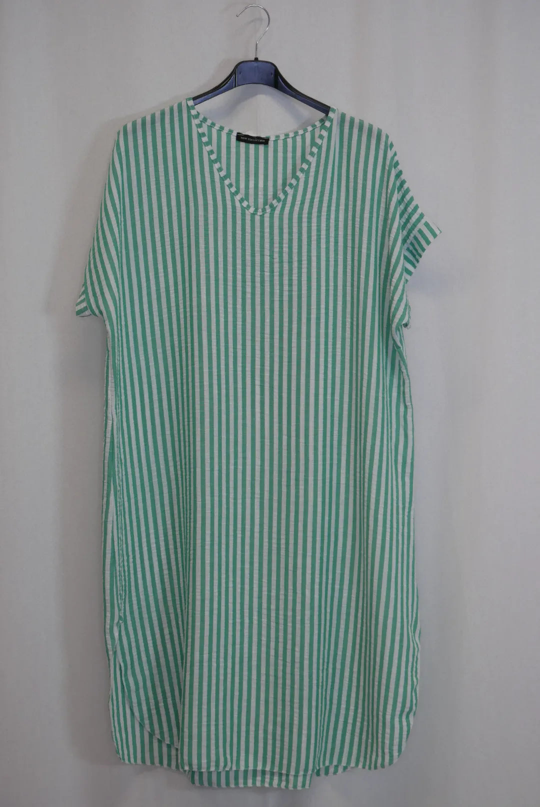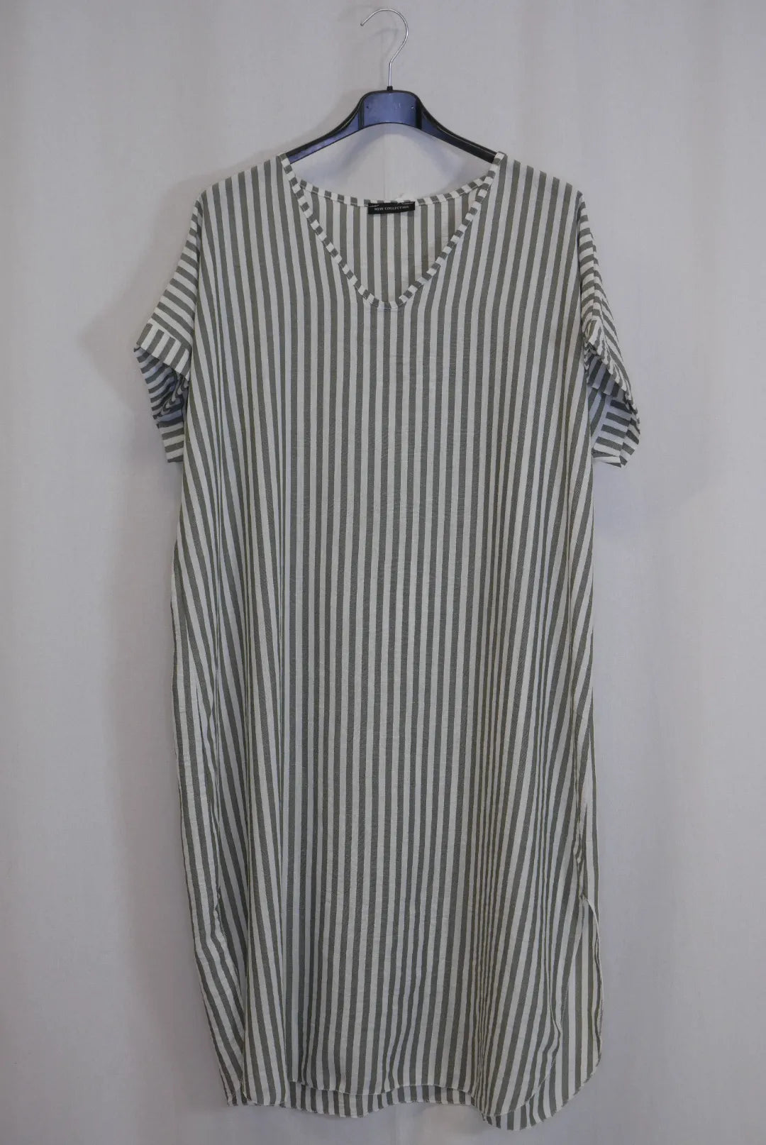 Ihanan kevyt raidallinen mekko, suora malli ja pienehkö V mallinen pääntie.