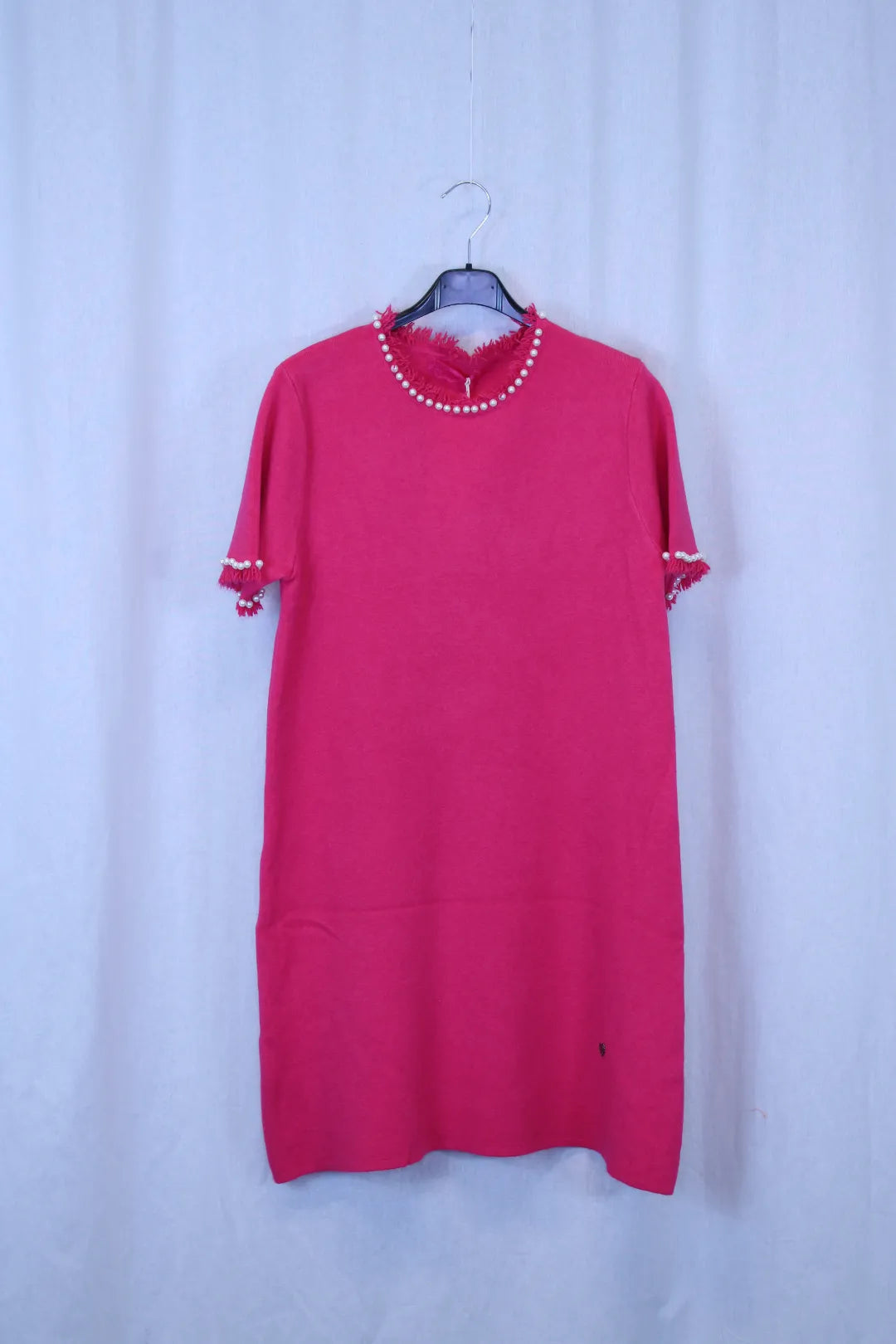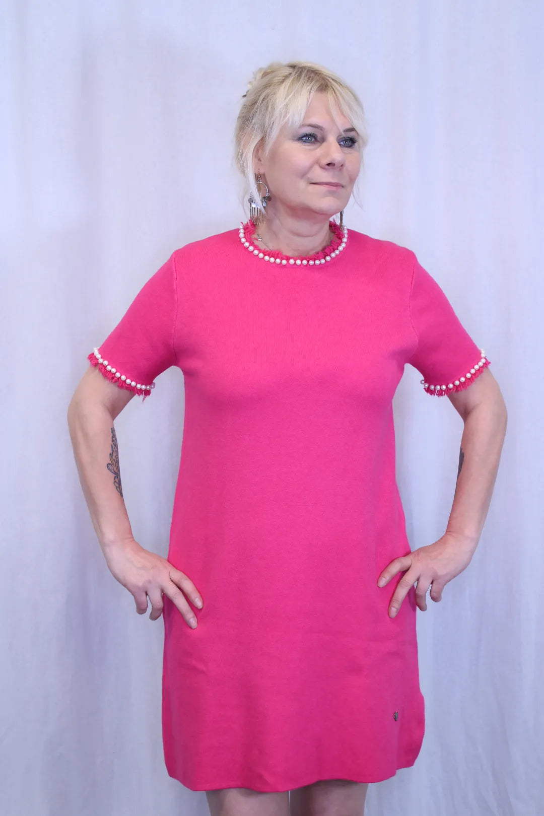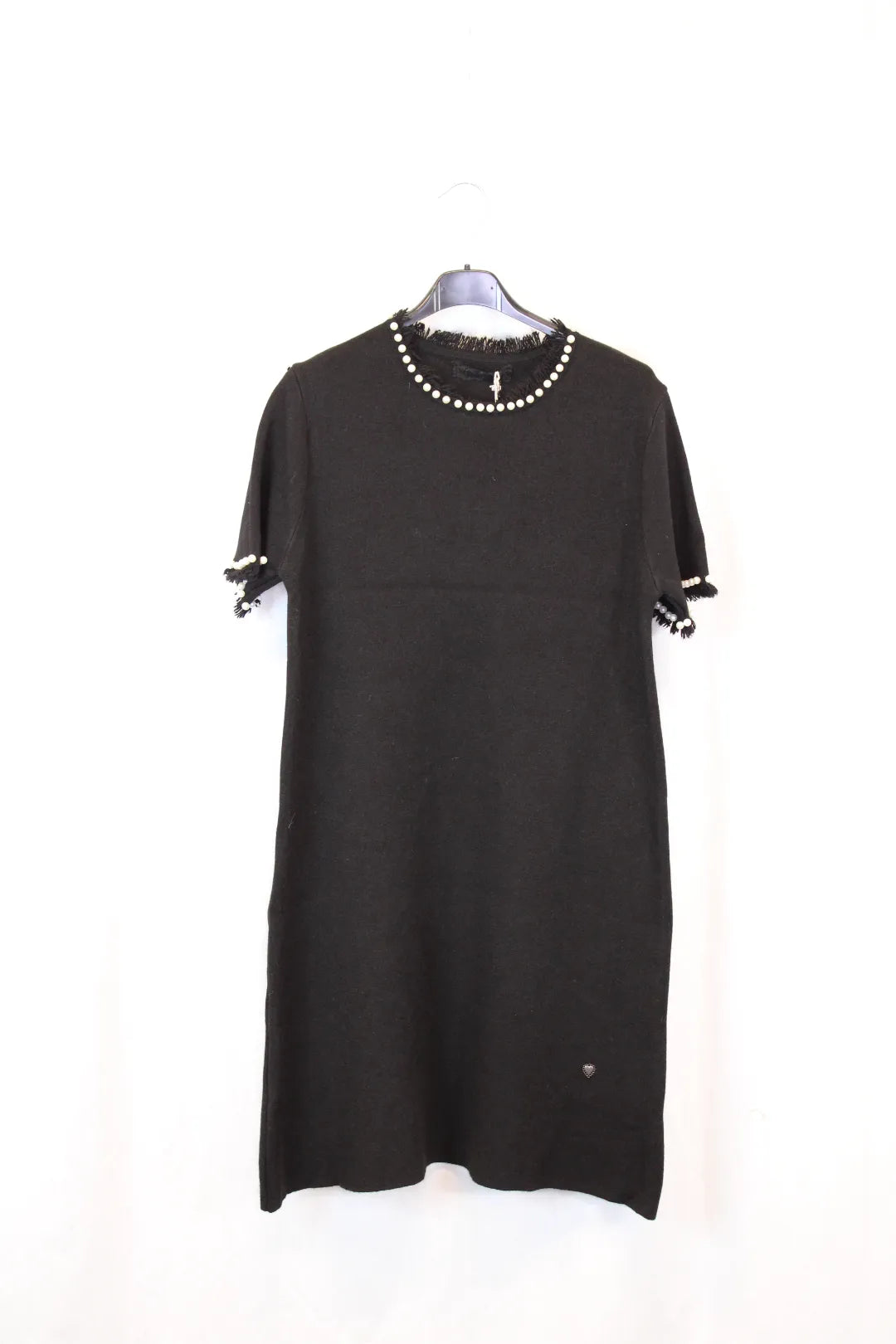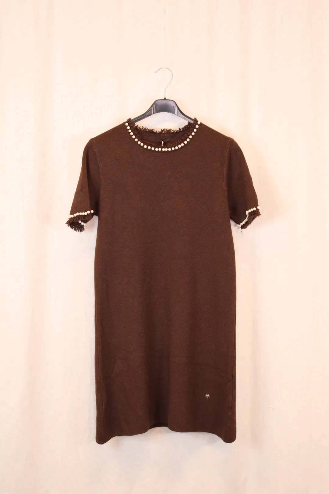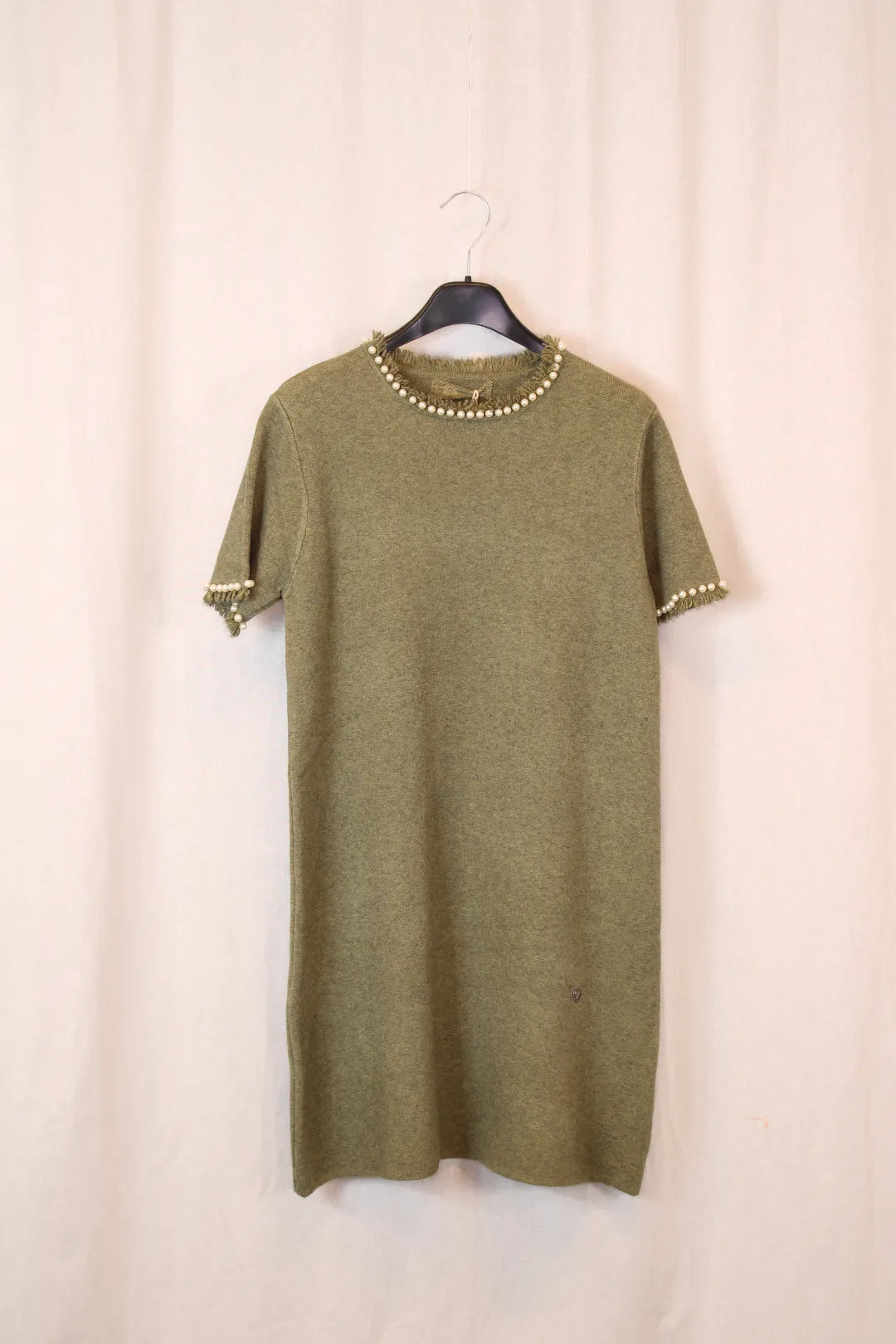 Kaunis neuletunika, jossa helmikoristeet kaula-aukolla ja hihansuissa.