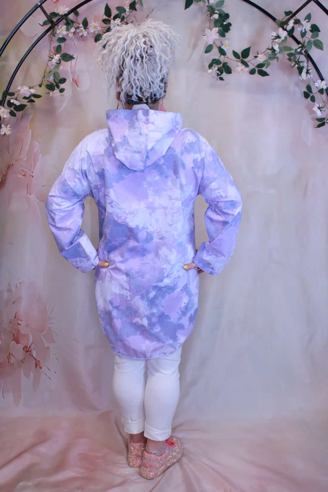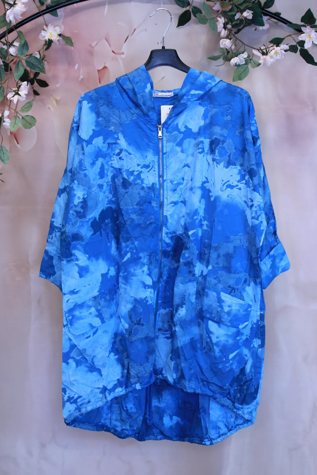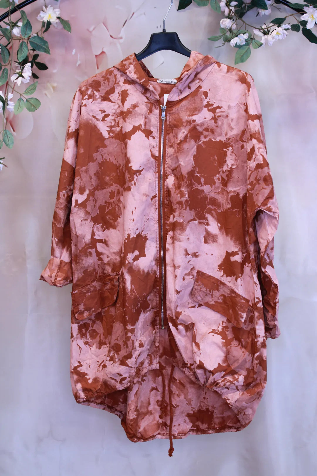 Takin väritys on useampaa eri väriä, joka antaa sille hieman boheemin ulkonäön. Takin helmassa on nauhat, joilla sitä voi kiristää.