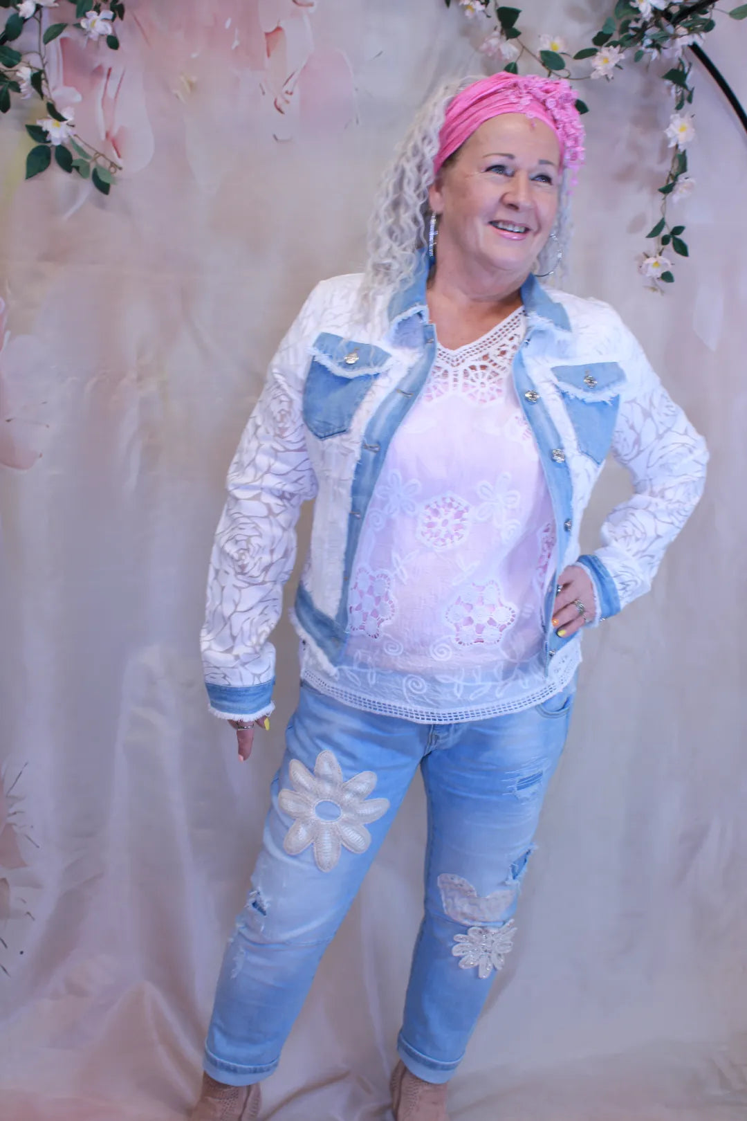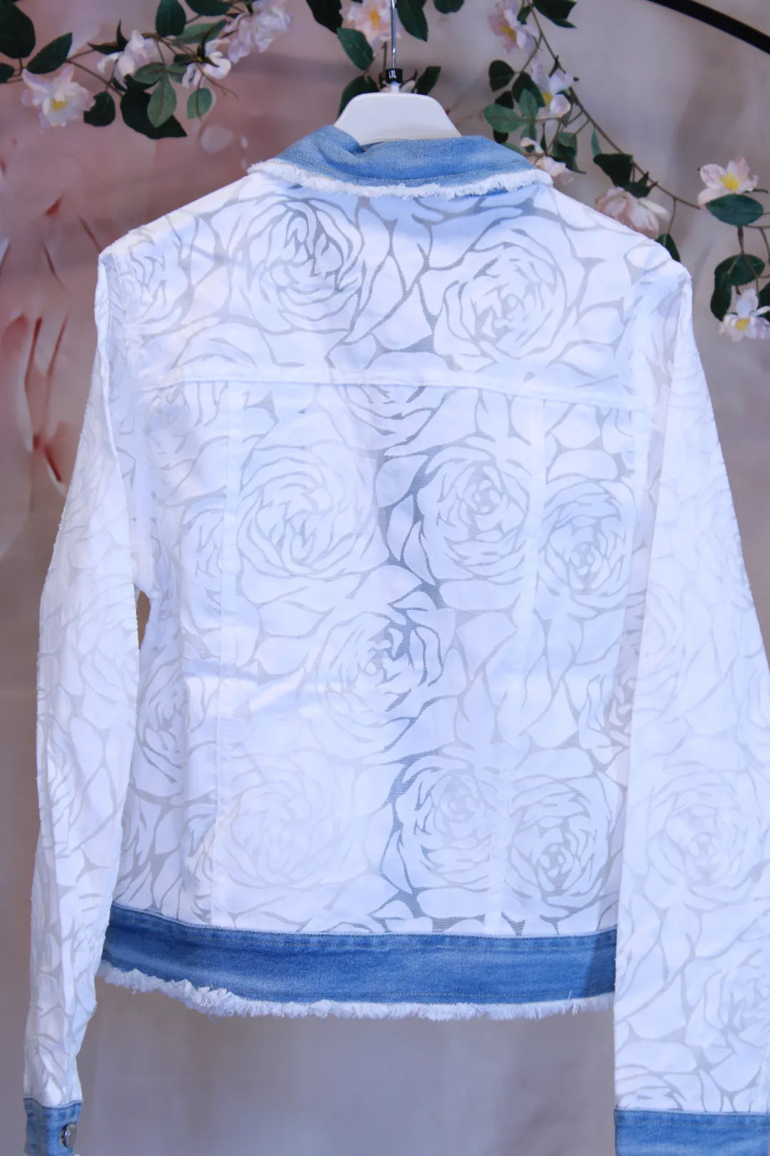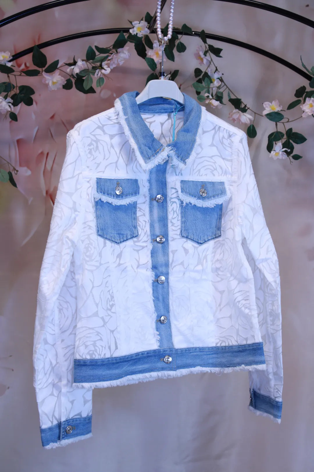 Romanttinen ja näyttävä kukkakuvioinen denimjakku yhdistää pehmeän kukkatekstuurin ja rennon farkkutyylin. Jakun kohokuvioinen kangas tuo pintaan kauniin kukkakuvion.