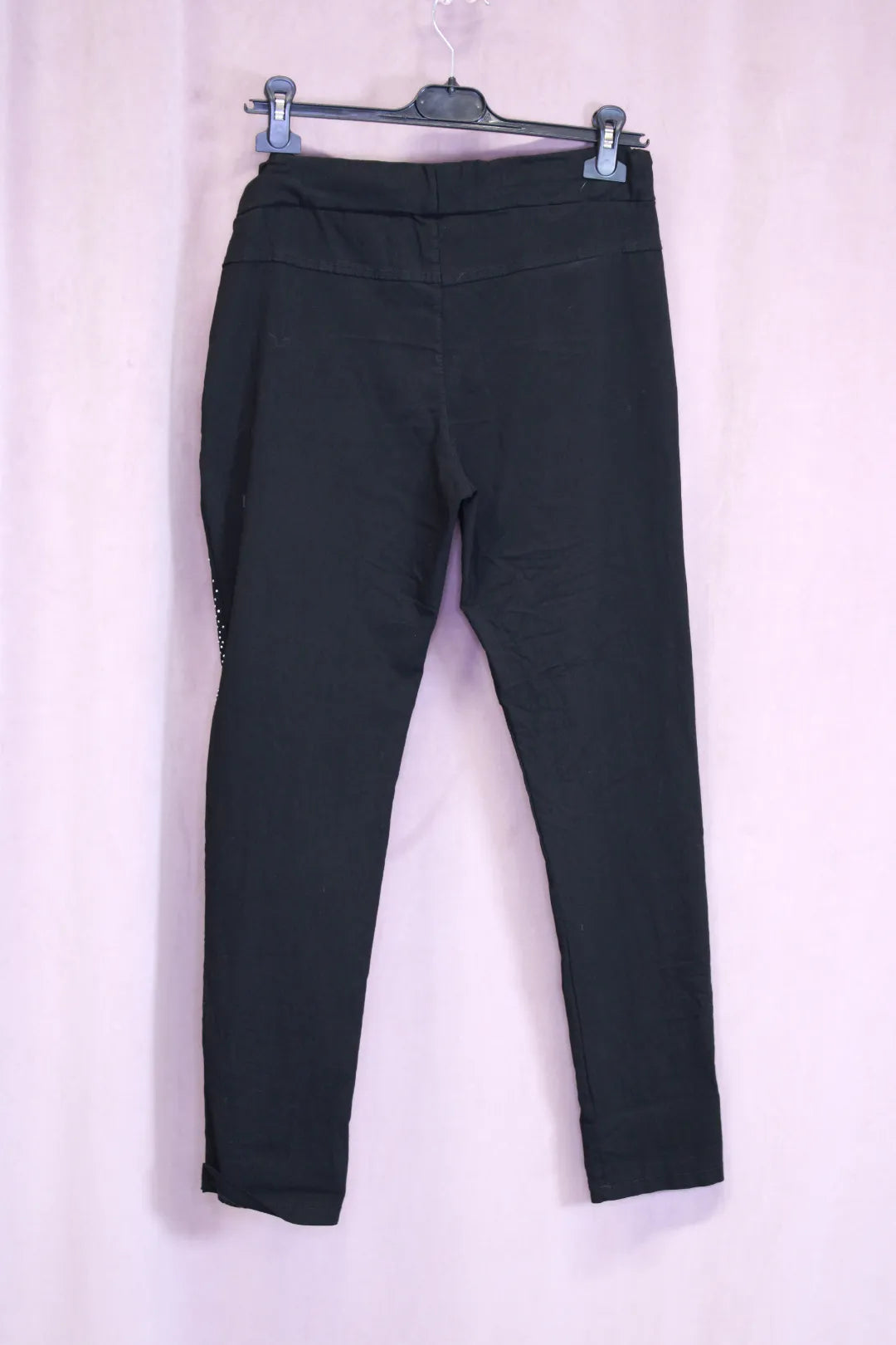 Rennot mutta näyttävät mustat housut, joissa lahkeissa kauniisti liukuva strassikuviointi. Joustava vyötärö ja taskut edessä. ✨