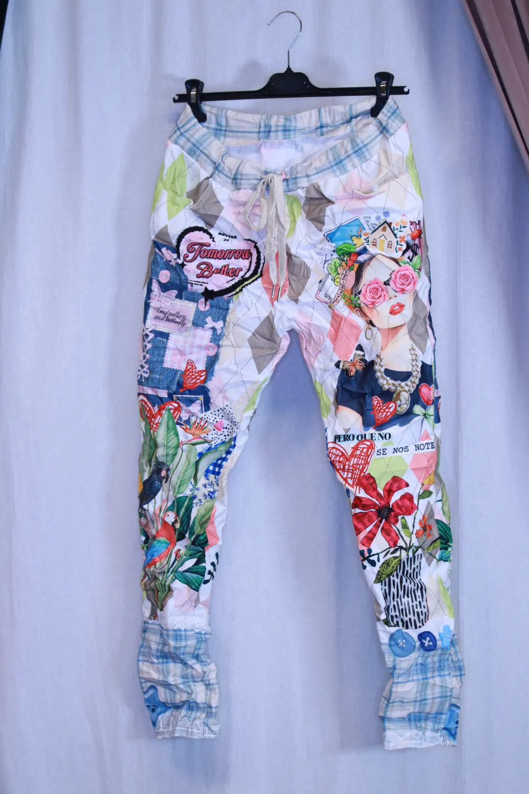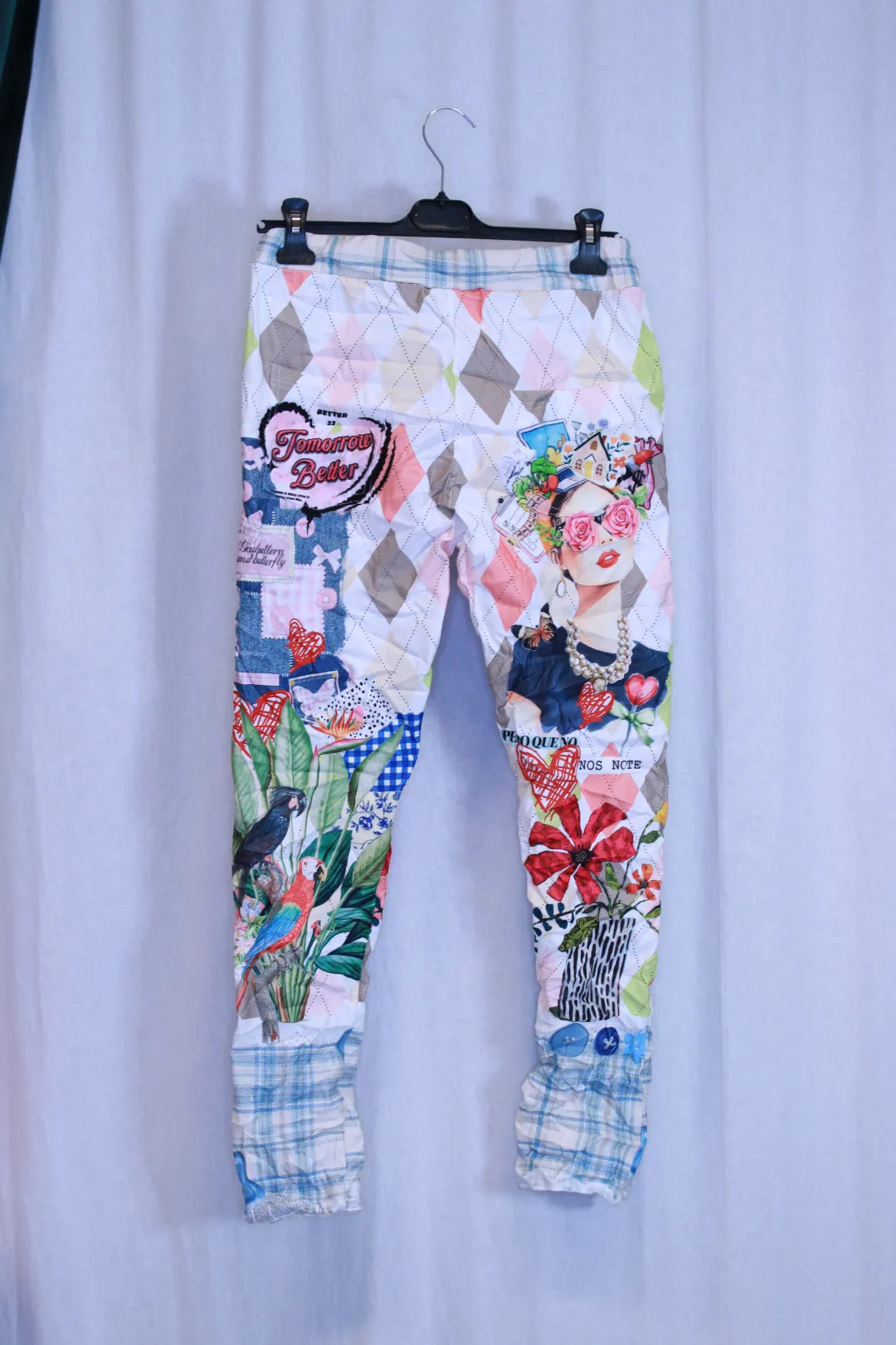 Nämä näyttävät kuviolliset housut ovat kuin pieni taideteos. Monivärinen printti yhdistää yksityiskohtia, muotoja, kukkia ja lintuaiheita luoden upean kokonaisuuden.