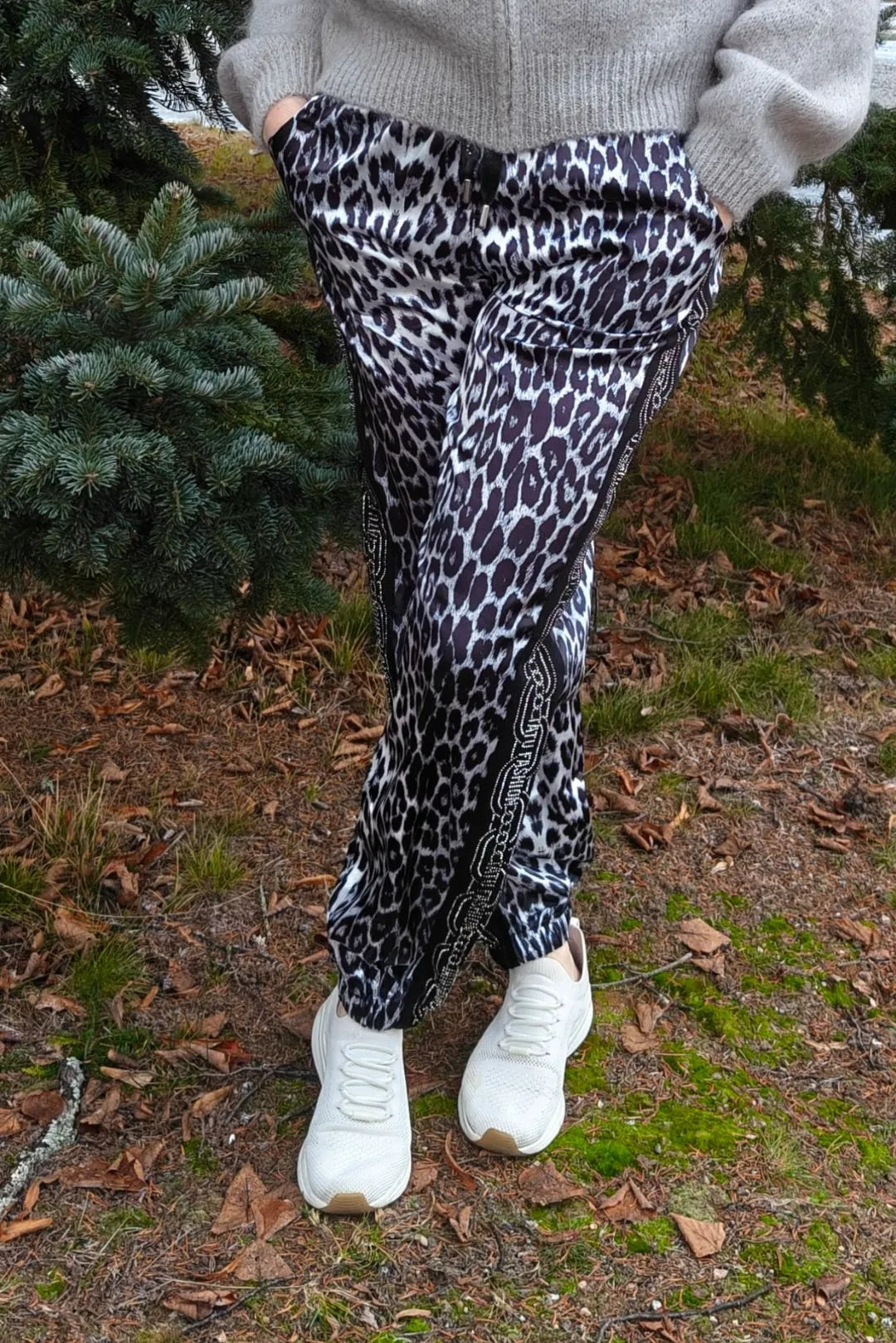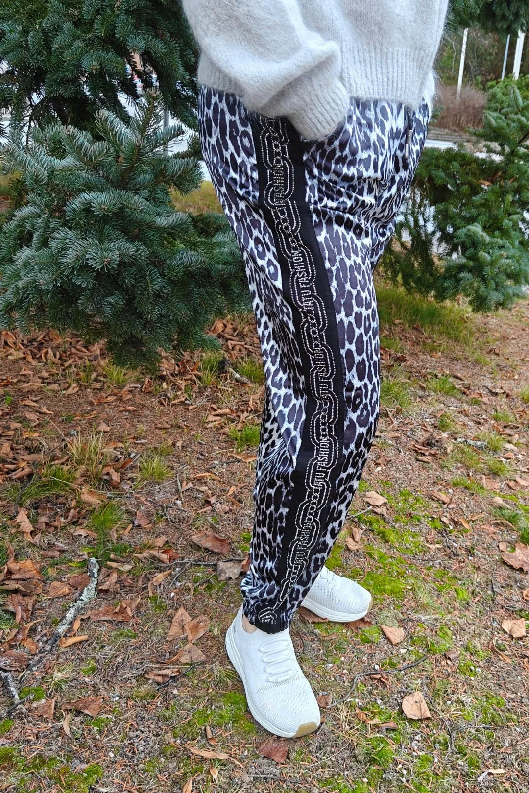 Upeat leopardihousut rento istuvuus, miellyttävä ohut materiaali. Housuissa kuminauhavyötärö, nauhakiristys ja kiristykset lahkeensuissa, Kimallekirjoitukset lahkeissa.