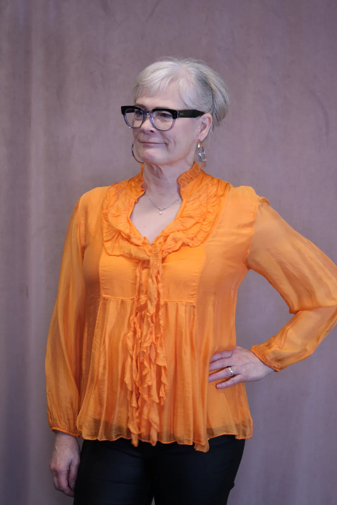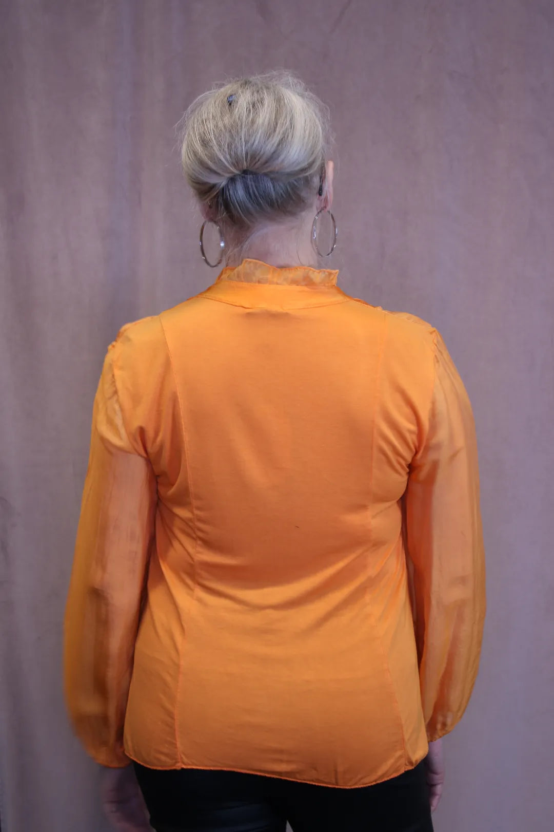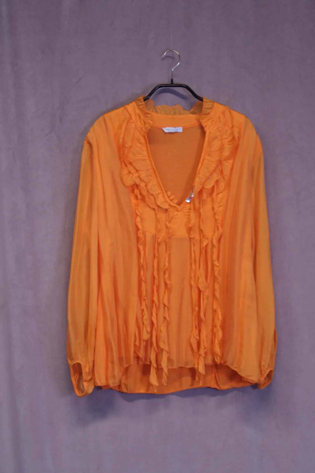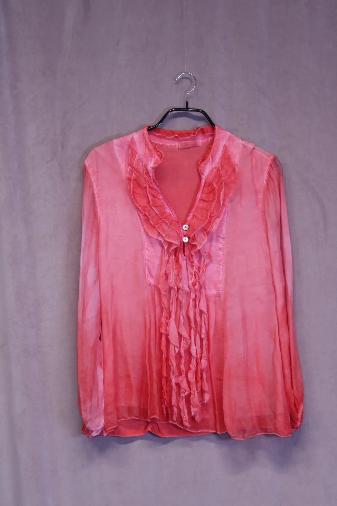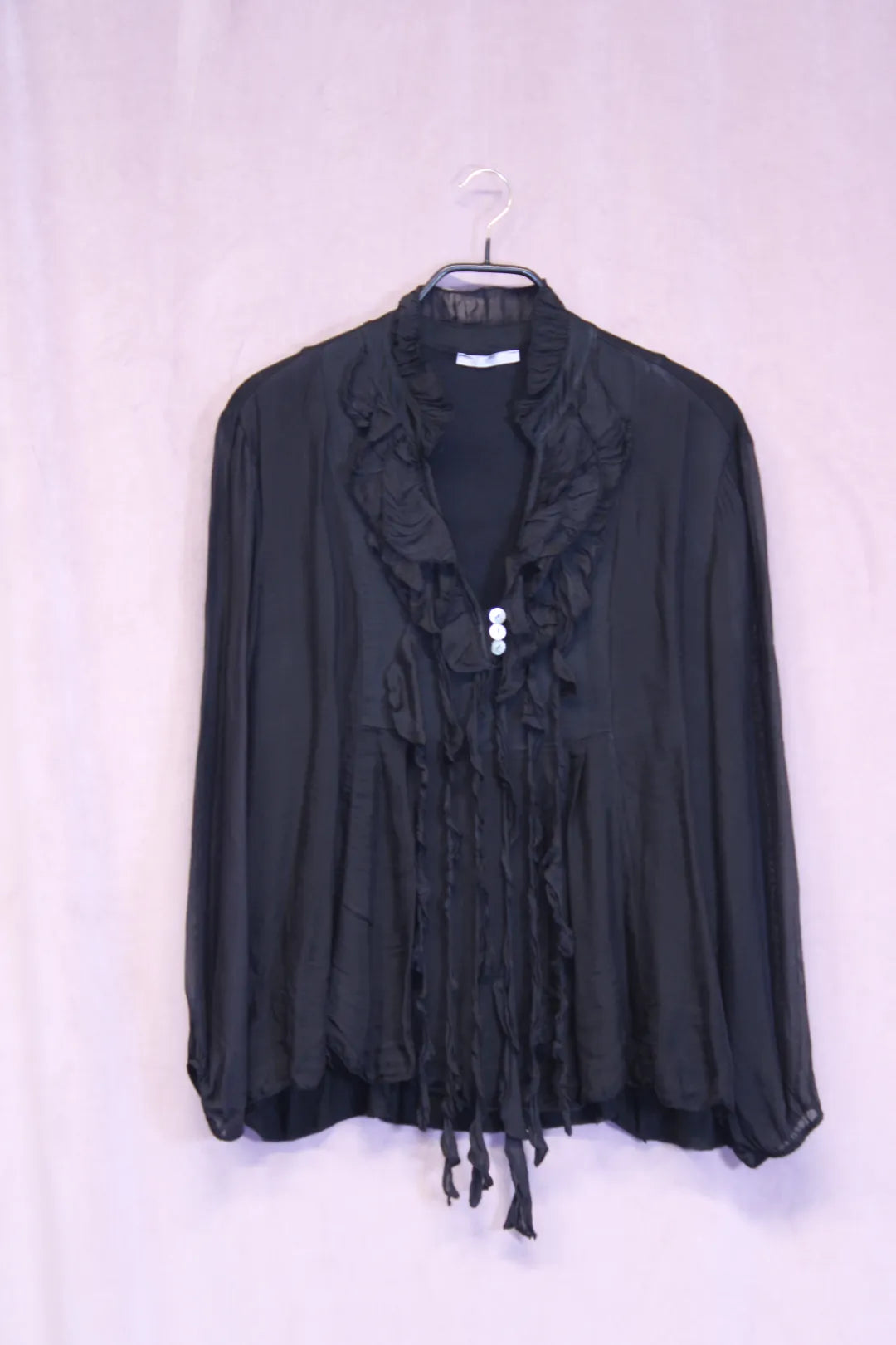 Kaunis silkkipaita, jossa rinnuksella kauniit röyhelöt. Selkä joustavaa trikoomateriaalia. One size koko.