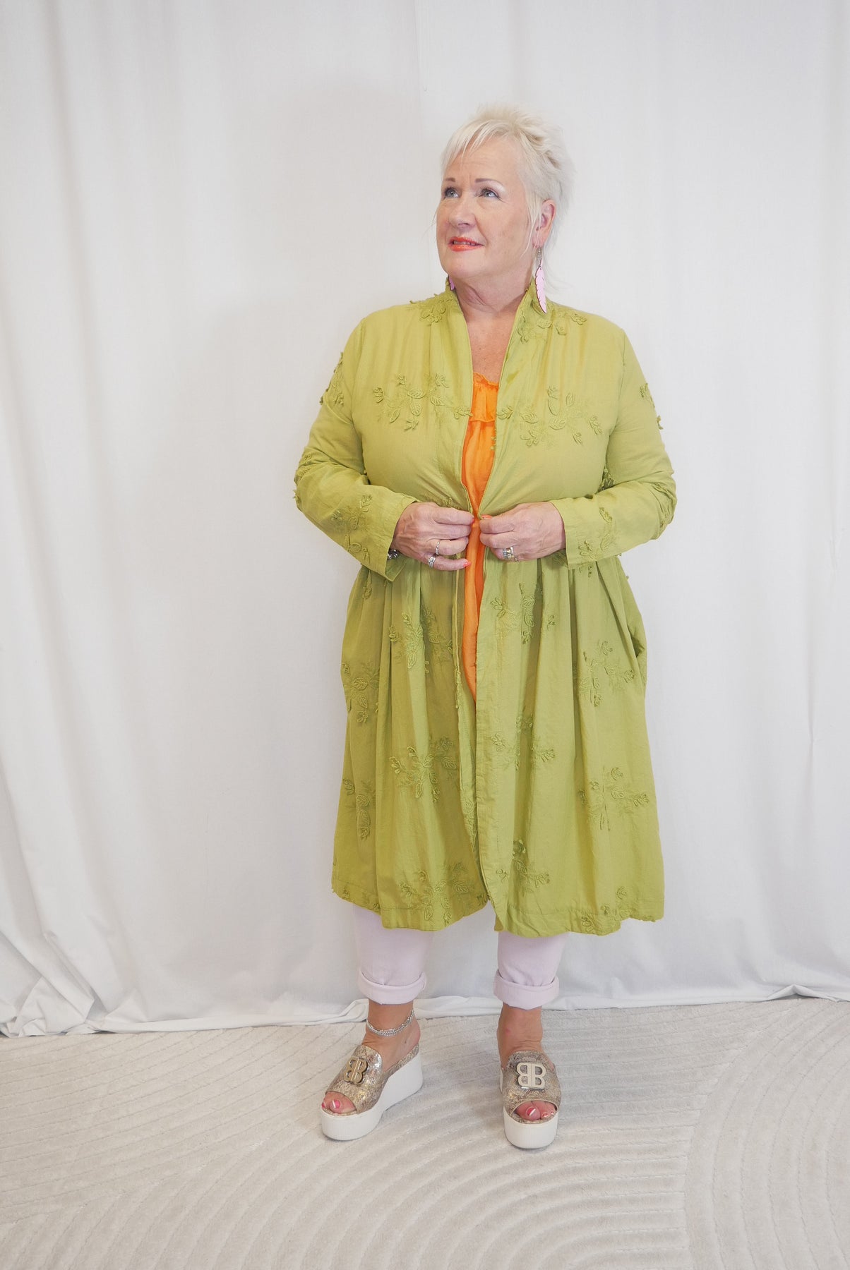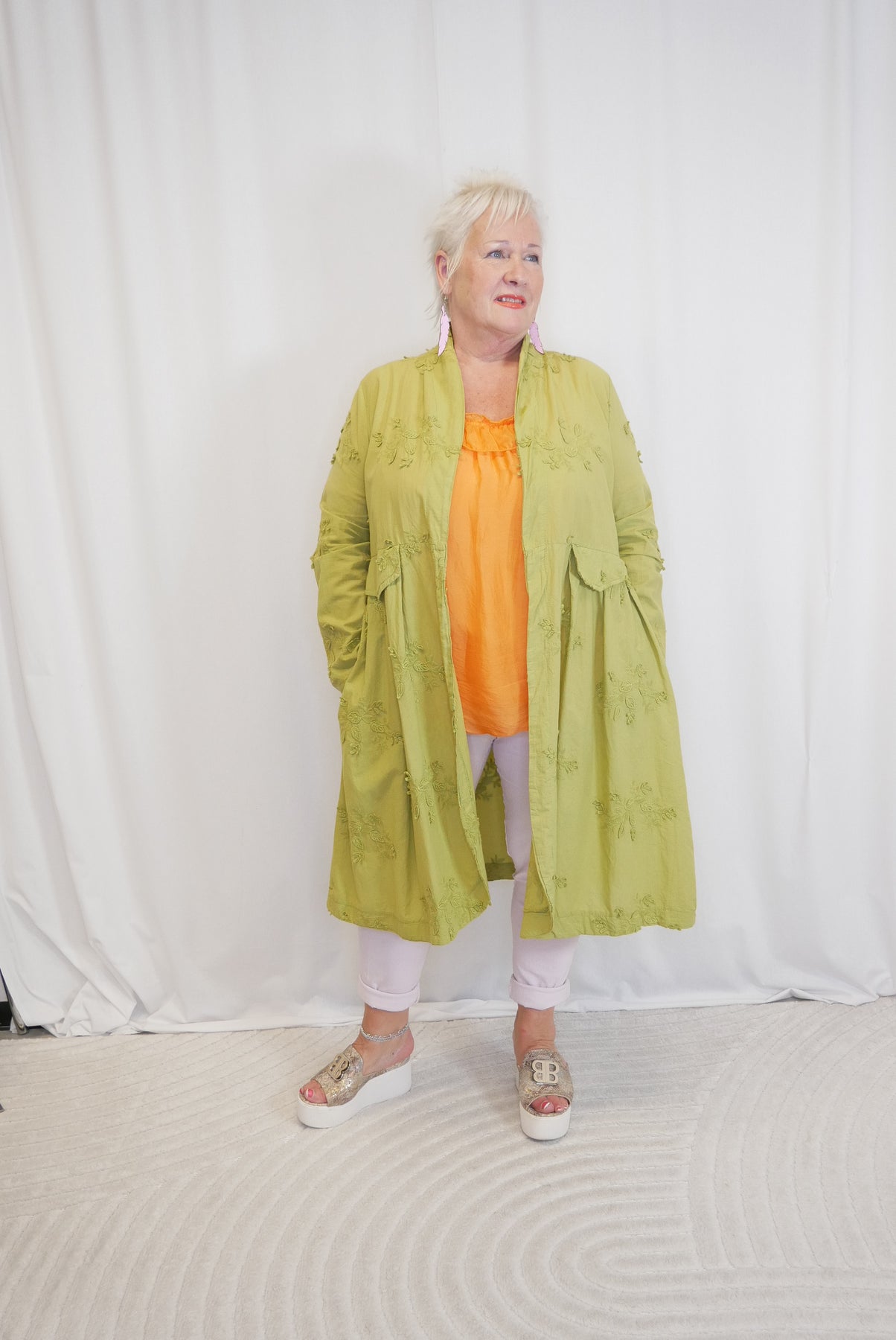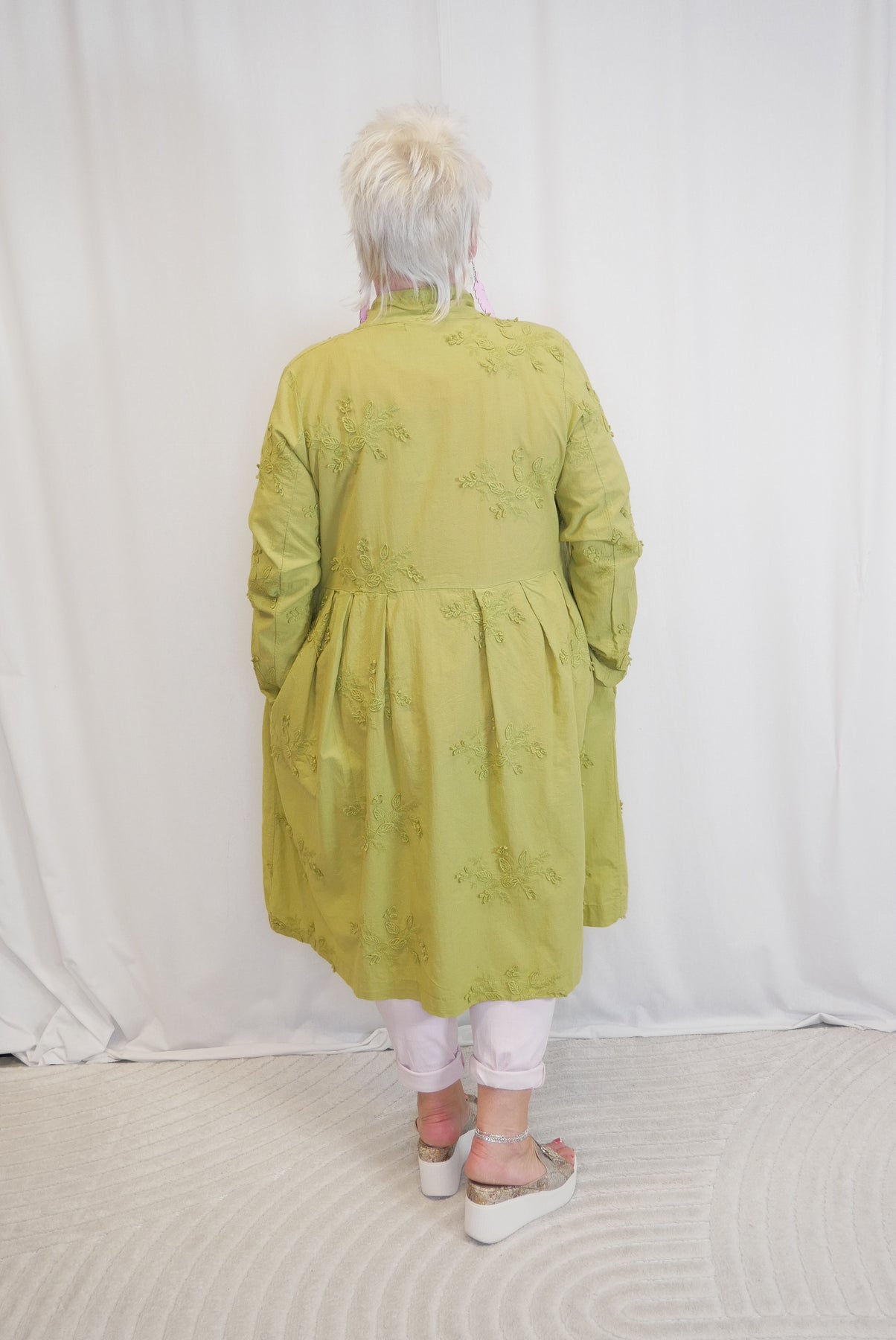 Kaunis pitkähihainen puuvillajakku, selässä rypytys. Edessä valetaskut mutta sivuilla myös oikeat taskut.