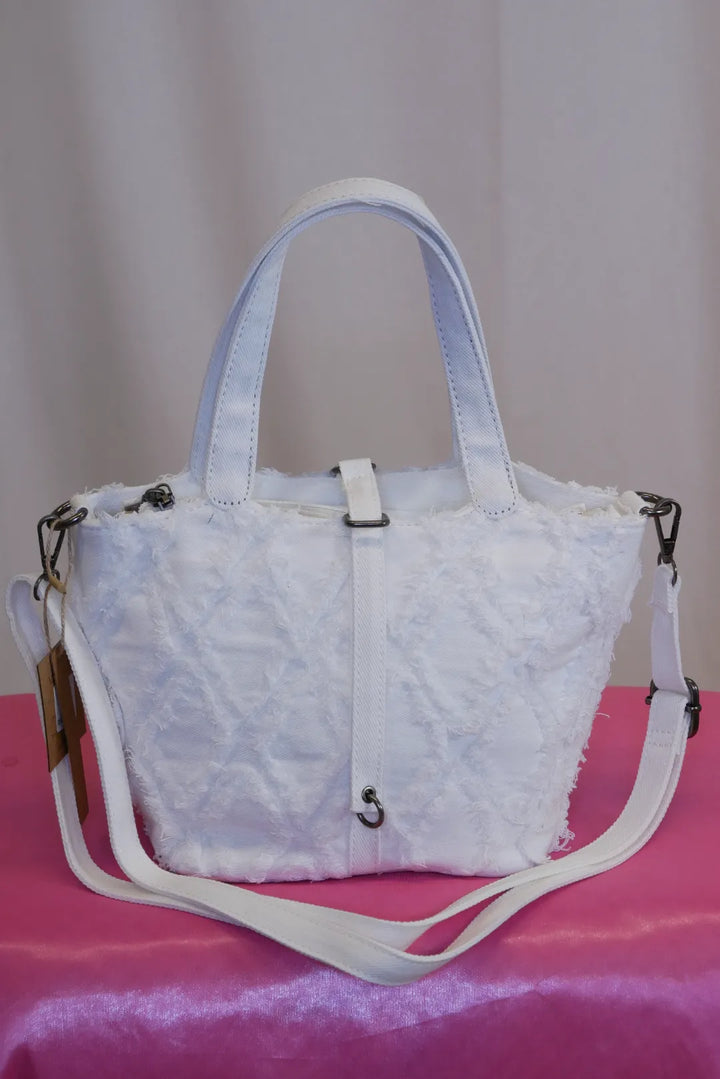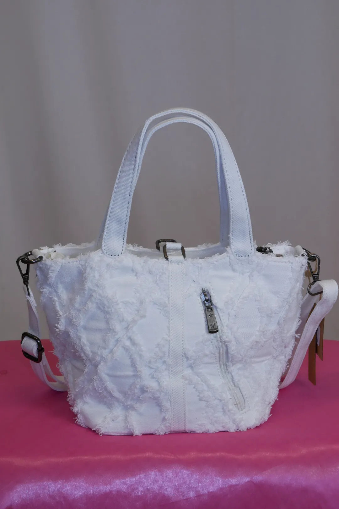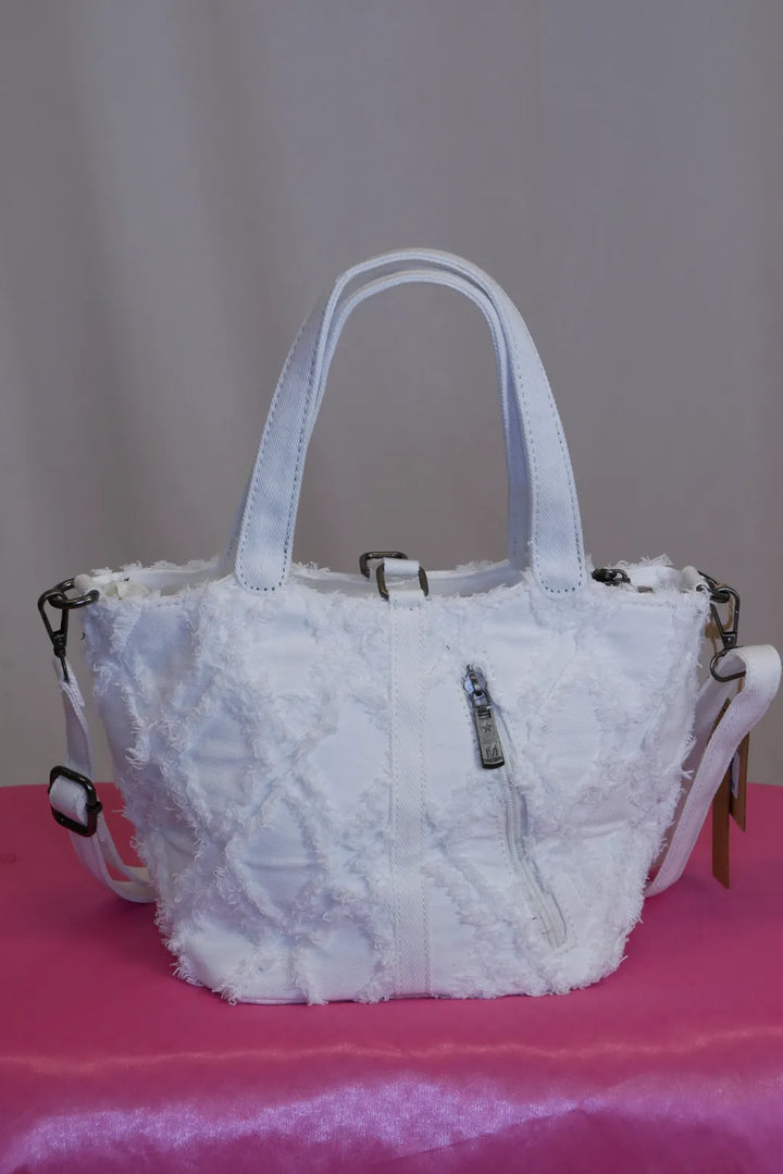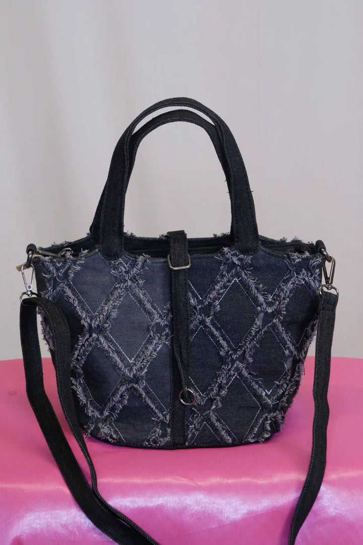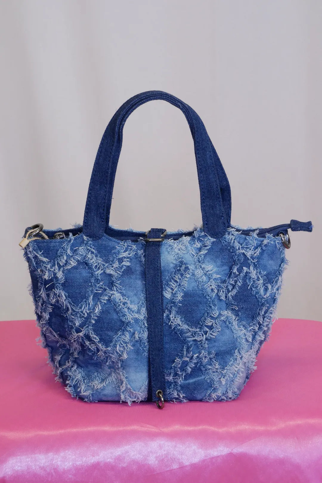 Tyylikäs farkkulaukku, jossa revitty ja kulutettu tekstuuri. Vetoketjukiinnitys ja mukana säädettävä ja irrotettava olkahihna.