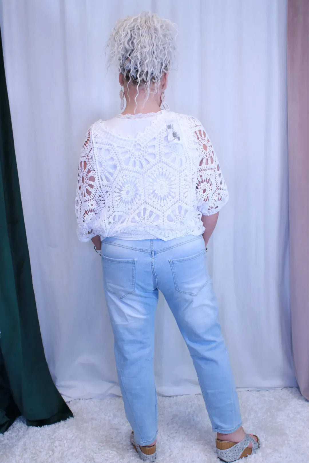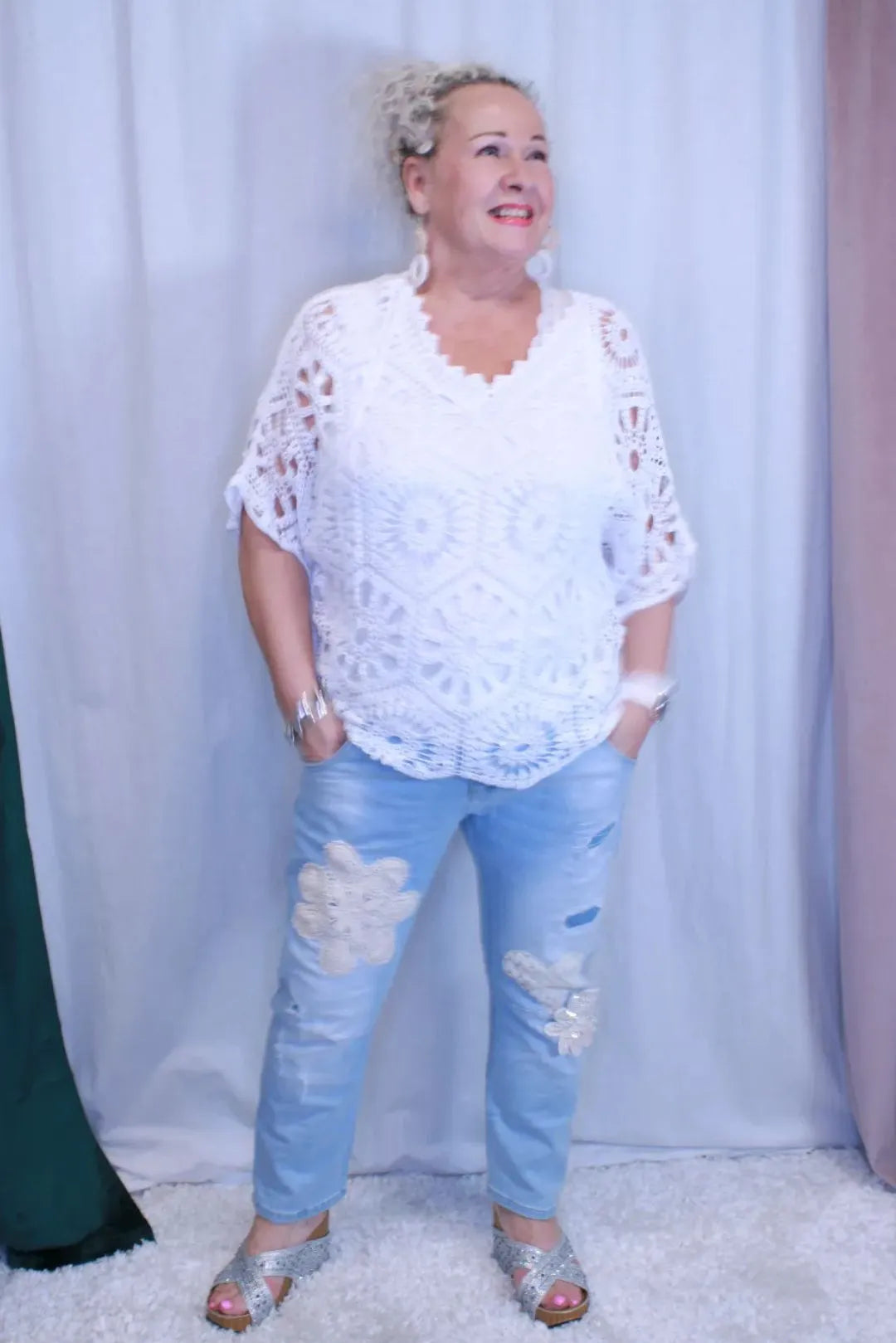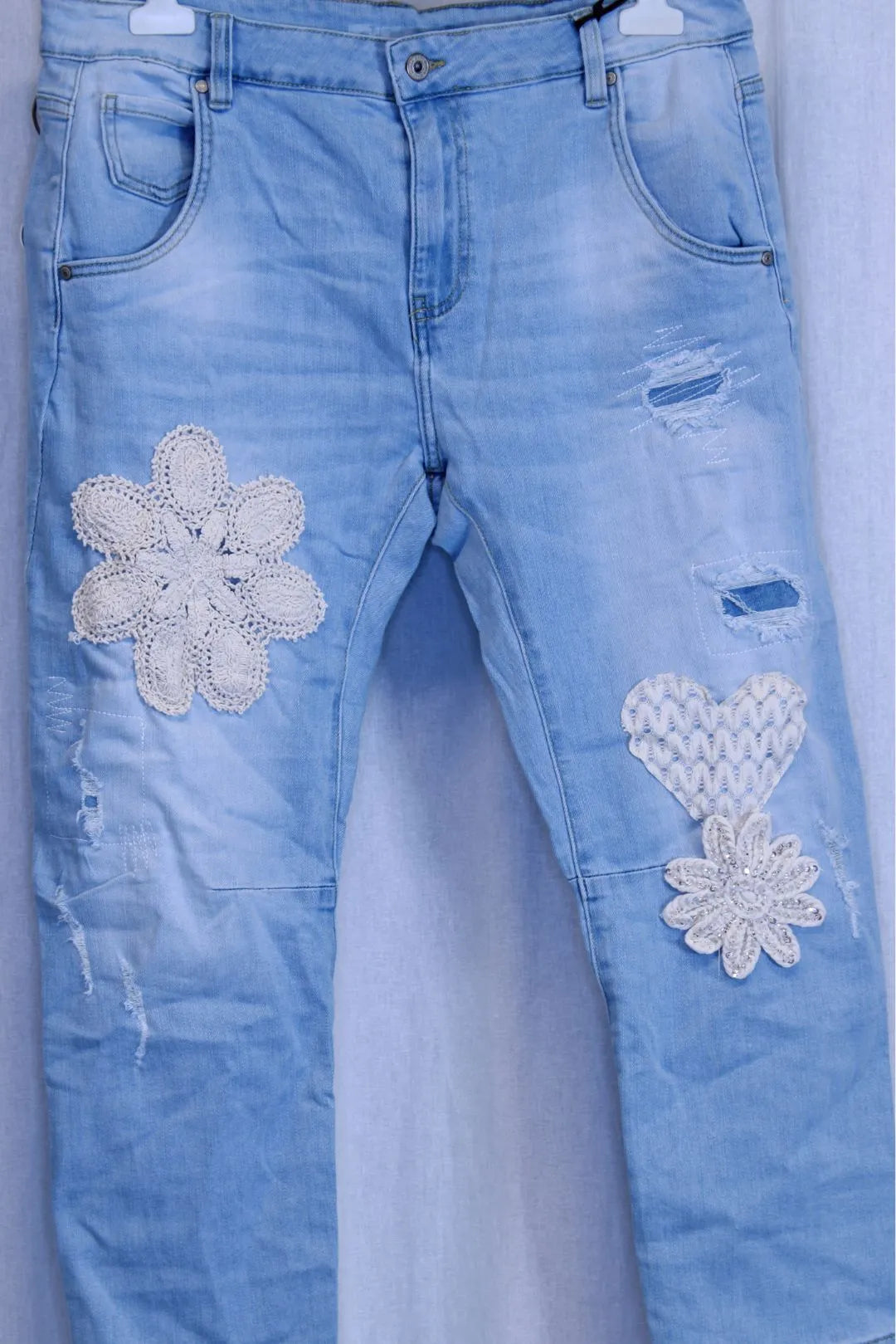 Farkkujen katseenvangitsijana toimii virkatut kukkakoristeet sekä pitsisydän. Kevyt kulutettu ilme ja hillityt rikotut kohdat viimeistelevät rennon ilmeen.