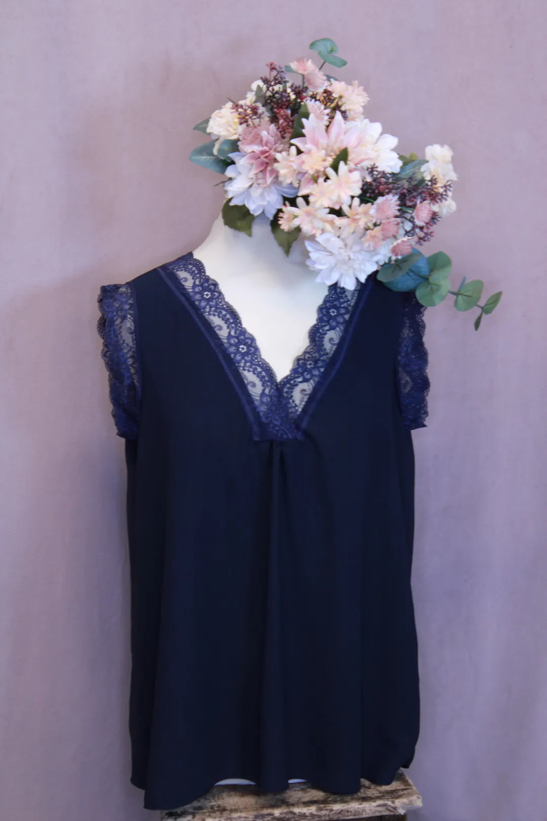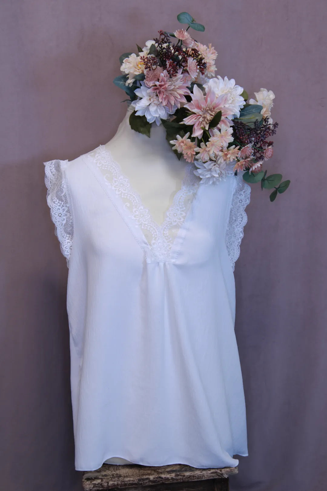 Kaunis naisellinen pitsitoppi. Loistava valinta esimerkiksi neuletakin alle tai muuhun kerrospukeutumiseen. Toimii hyvin myös yksinään. Kevyt, miellyttävä ja kauniisti laskeutuva materiaali.