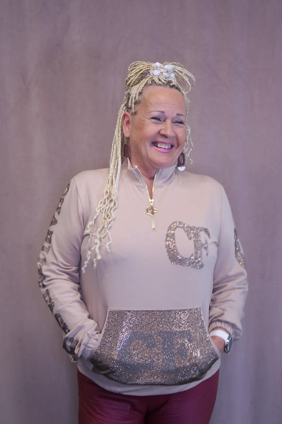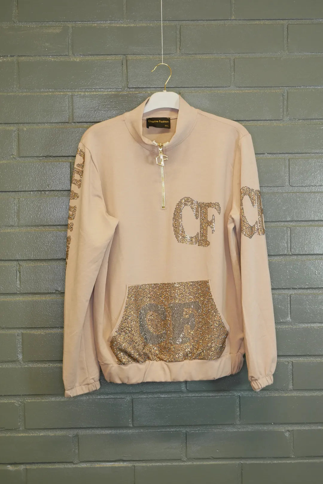 Upeasti kimaltava huppari. Kaula-aukolla vetoketju ja edessä strasseilla koristeltu tasku. Huom ei huppua.
