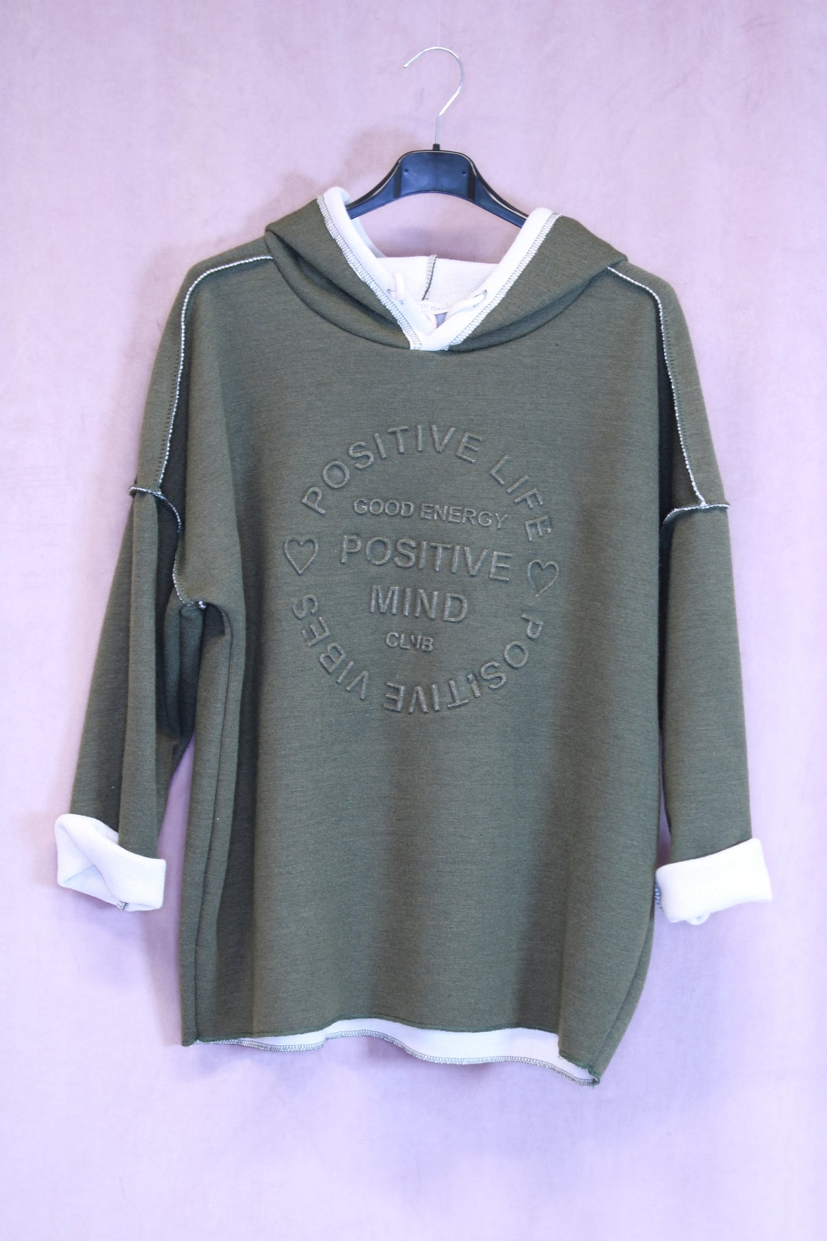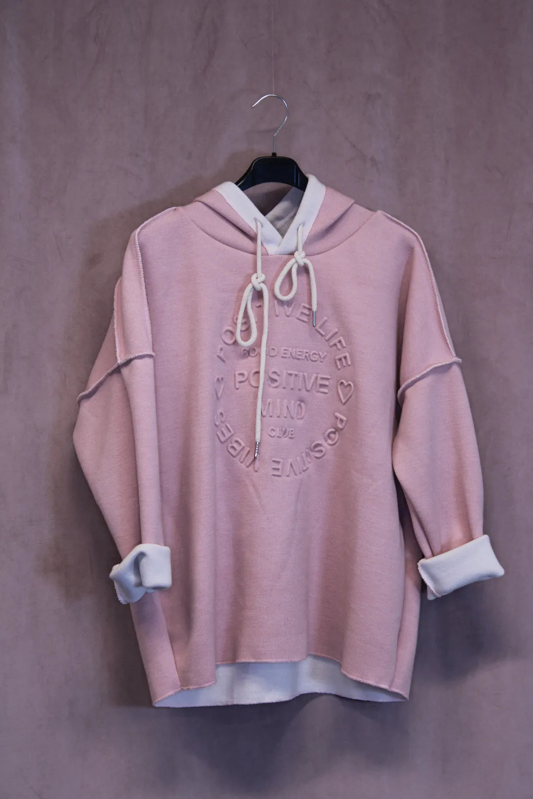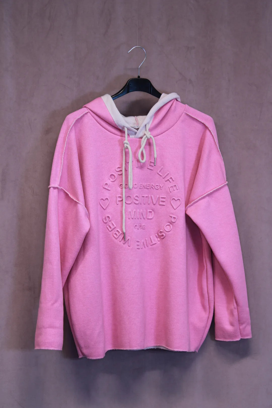 Miellyttävän pehmeä huppari, jossa kohokuvioitu teksti Positive Mind. One size koko. Made in Italy.