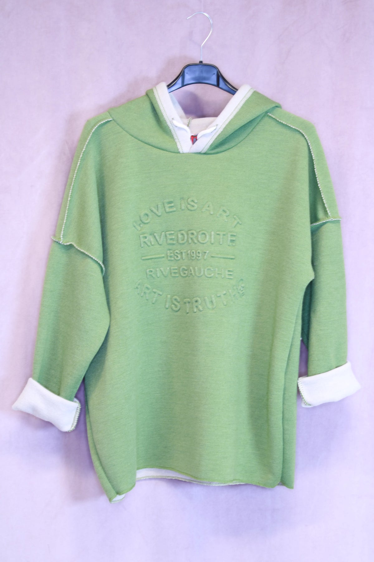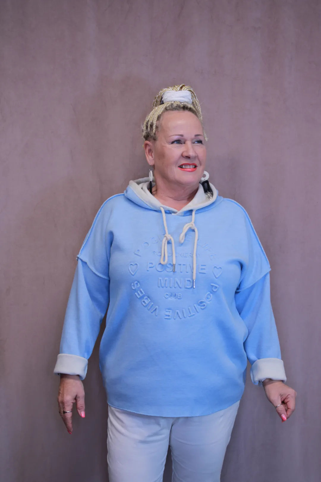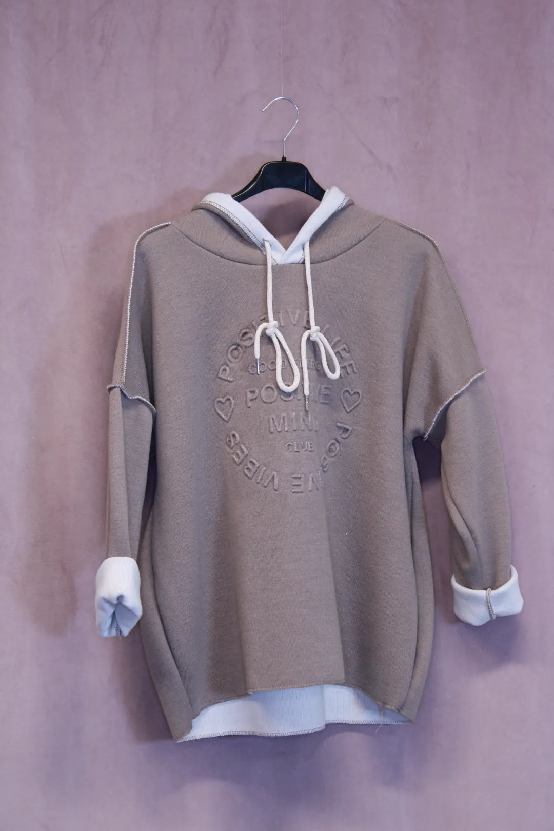 Miellyttävän pehmeä huppari, jossa kohokuvioitu teksti Positive Mind. One size koko. Made in Italy.