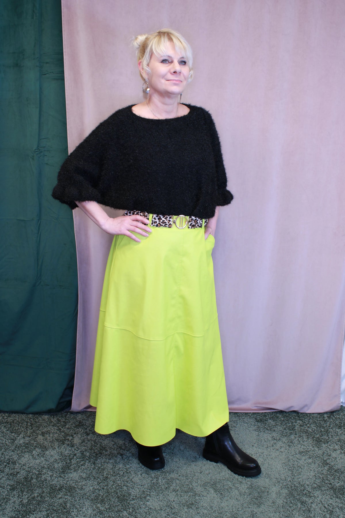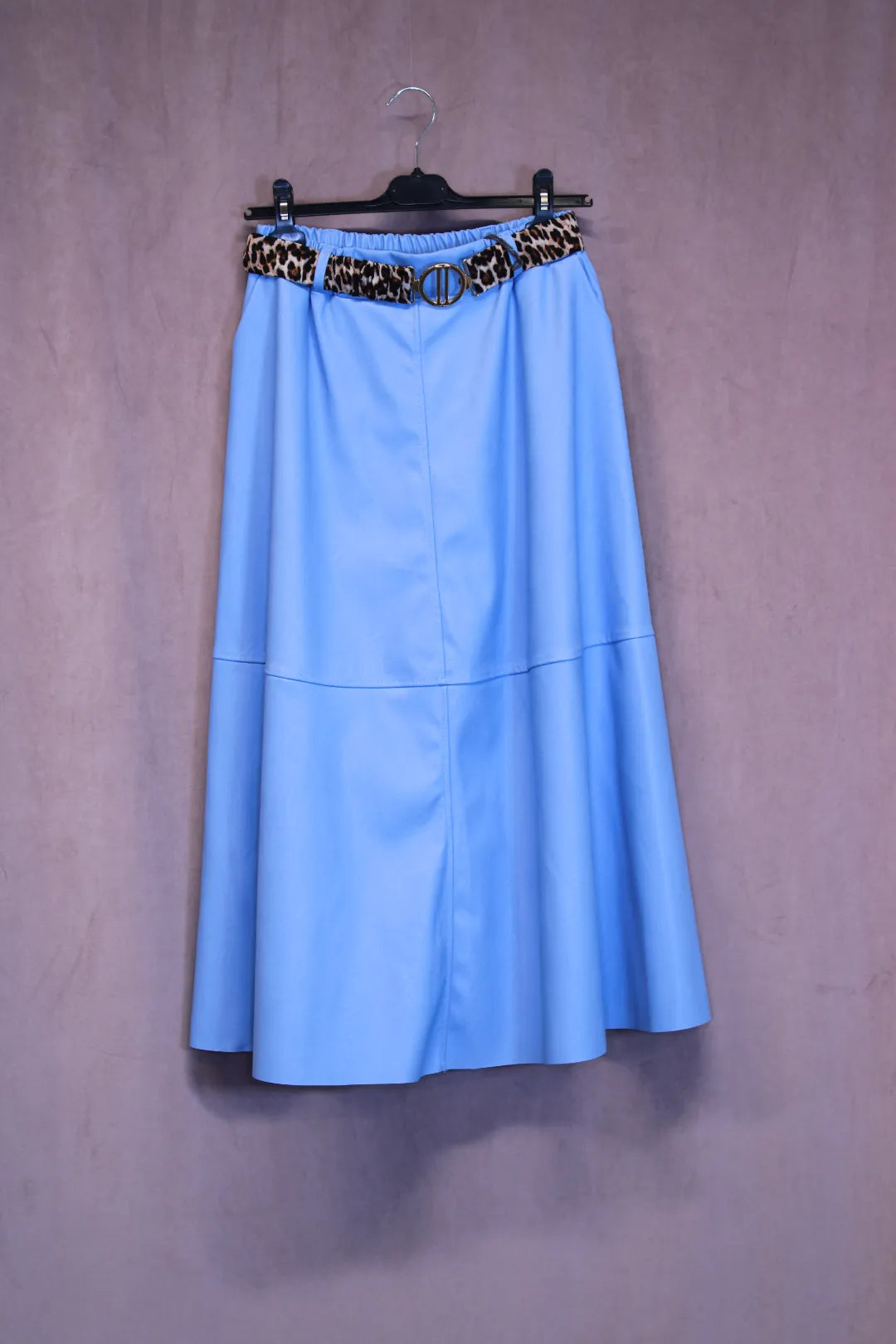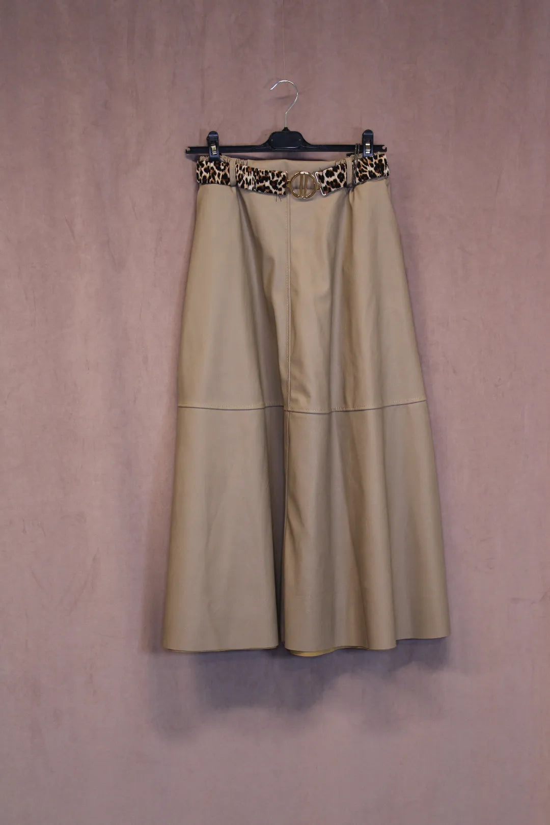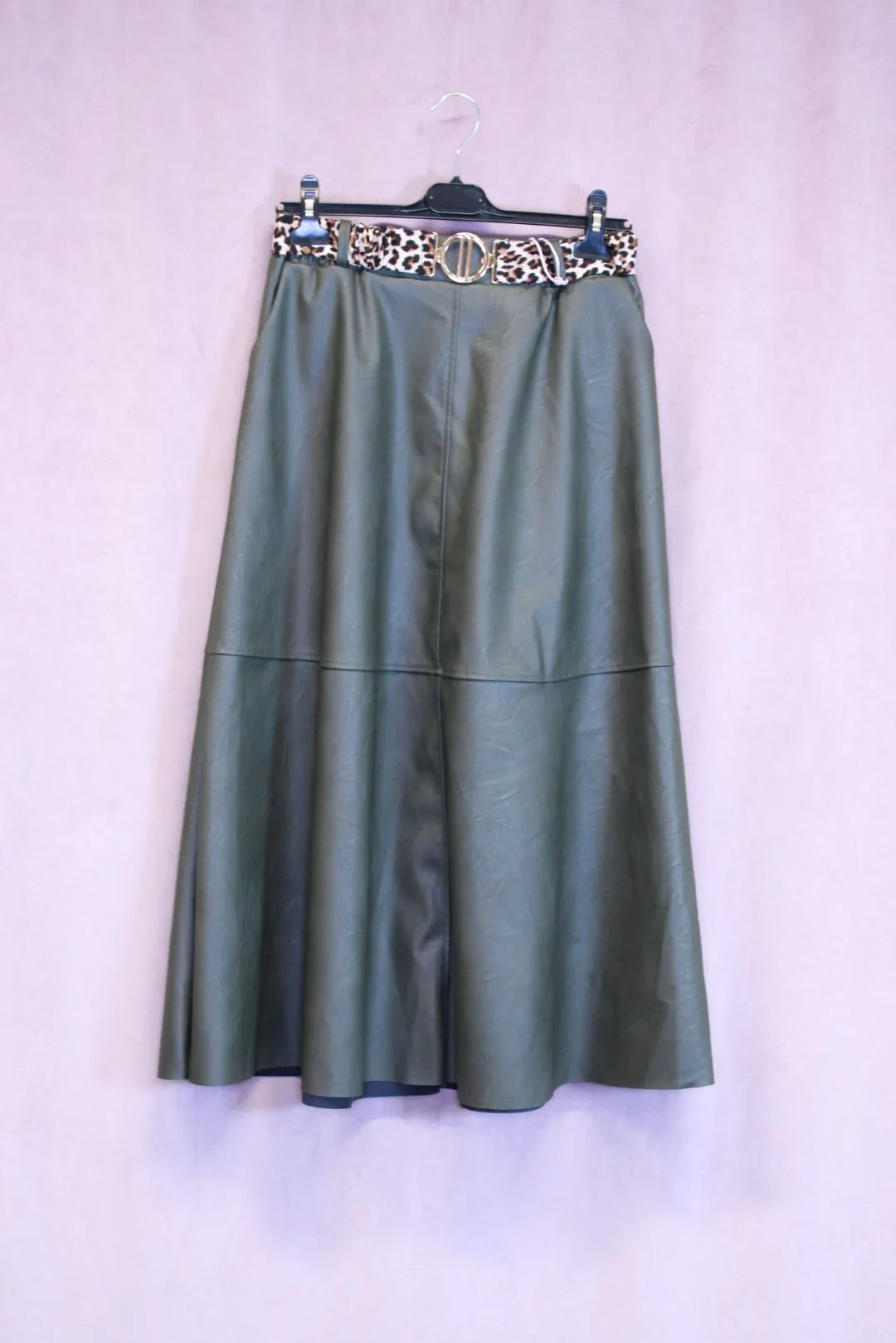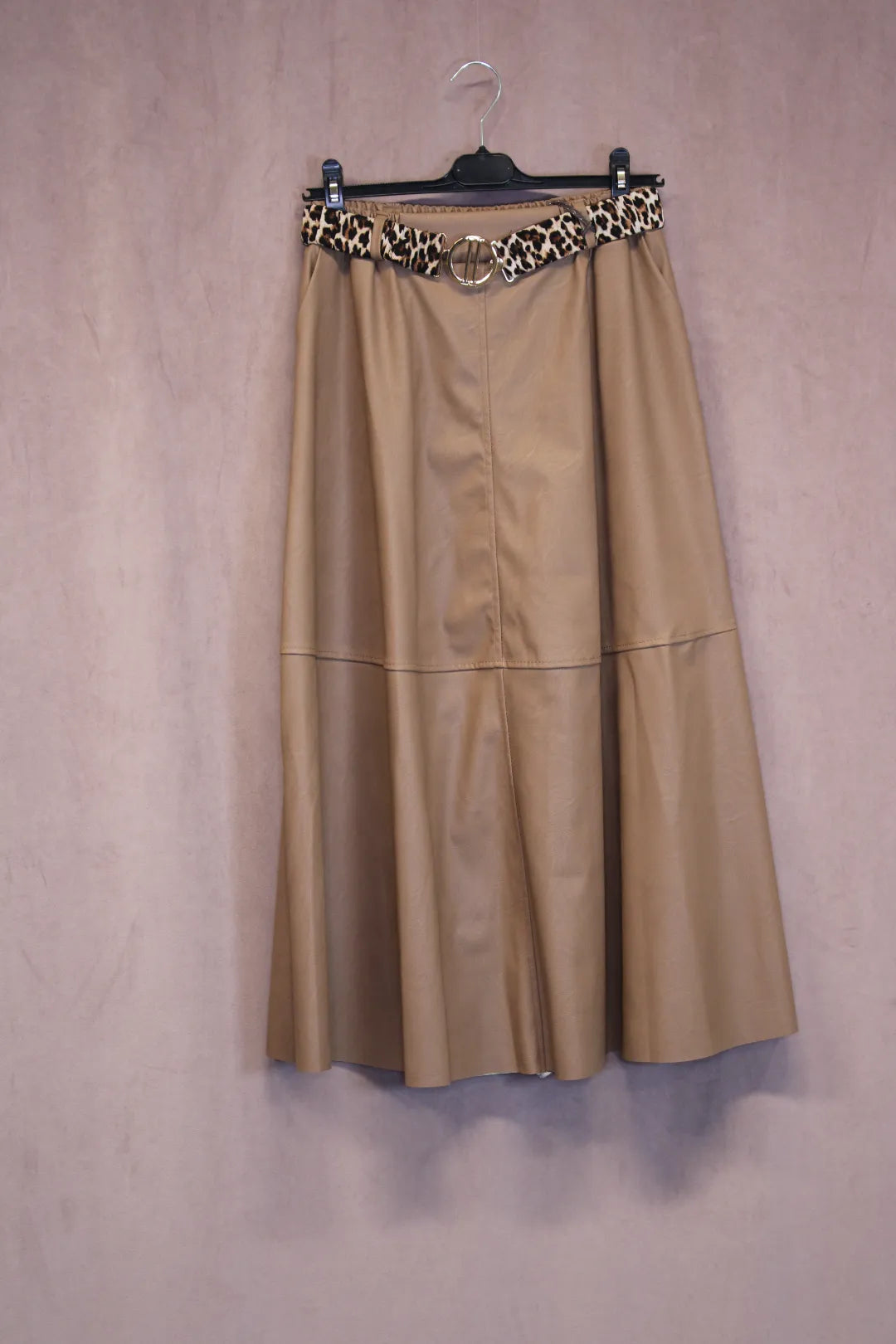 Kaunis tekstiilinahkainen A-linjainen hame. Hametta on helppo yhdistää erillaisten tilaisuuksien mukaan. Irroitettava leopardikuvioitu vyö kultaisella soljella.