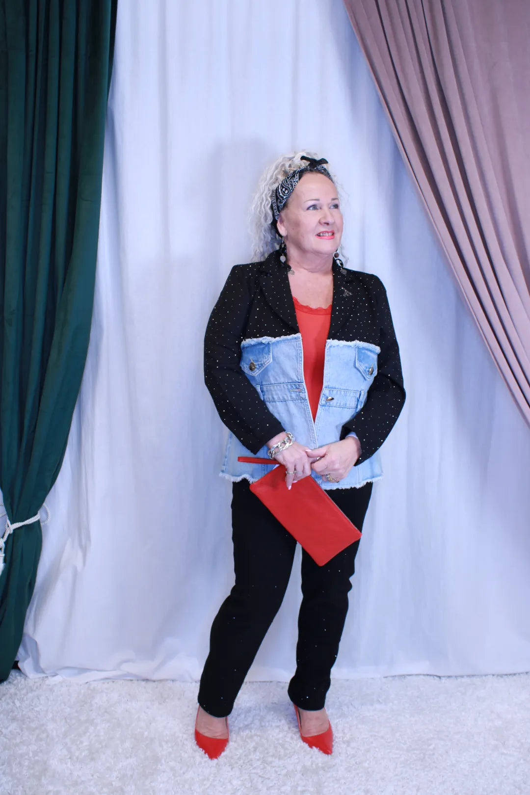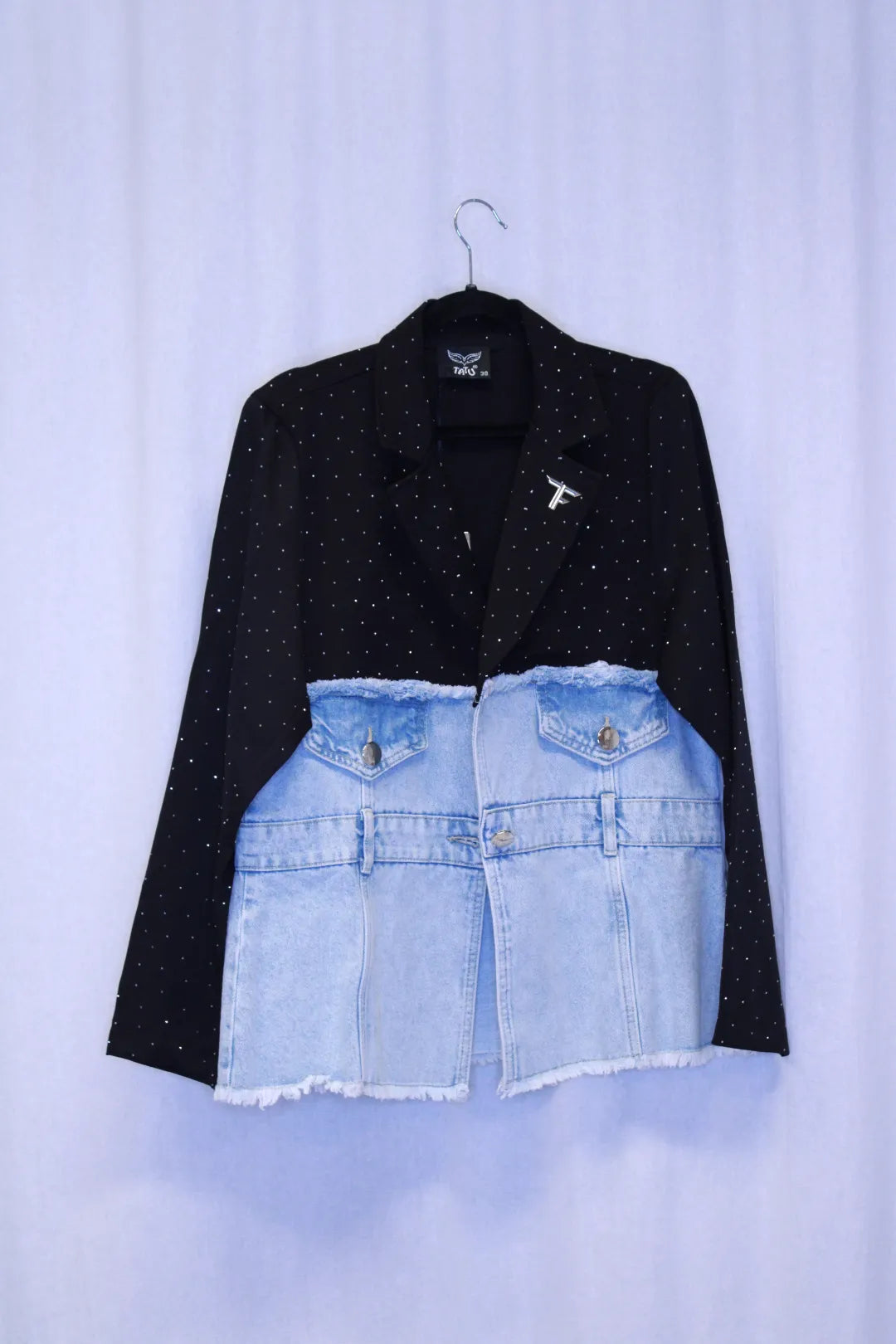 Upeasti kimaltava jakkutakki, jossa alaosa farkkukangasta. Takissa on raakahelmainen viimeistely. Helppo yhdistää mekon tai housujen kanssa. Tämä takki luo asuun rohkeaa sähäkkyyttä jolla taatusti erotut 😍. Takissa on yhden napin kiinnitys.