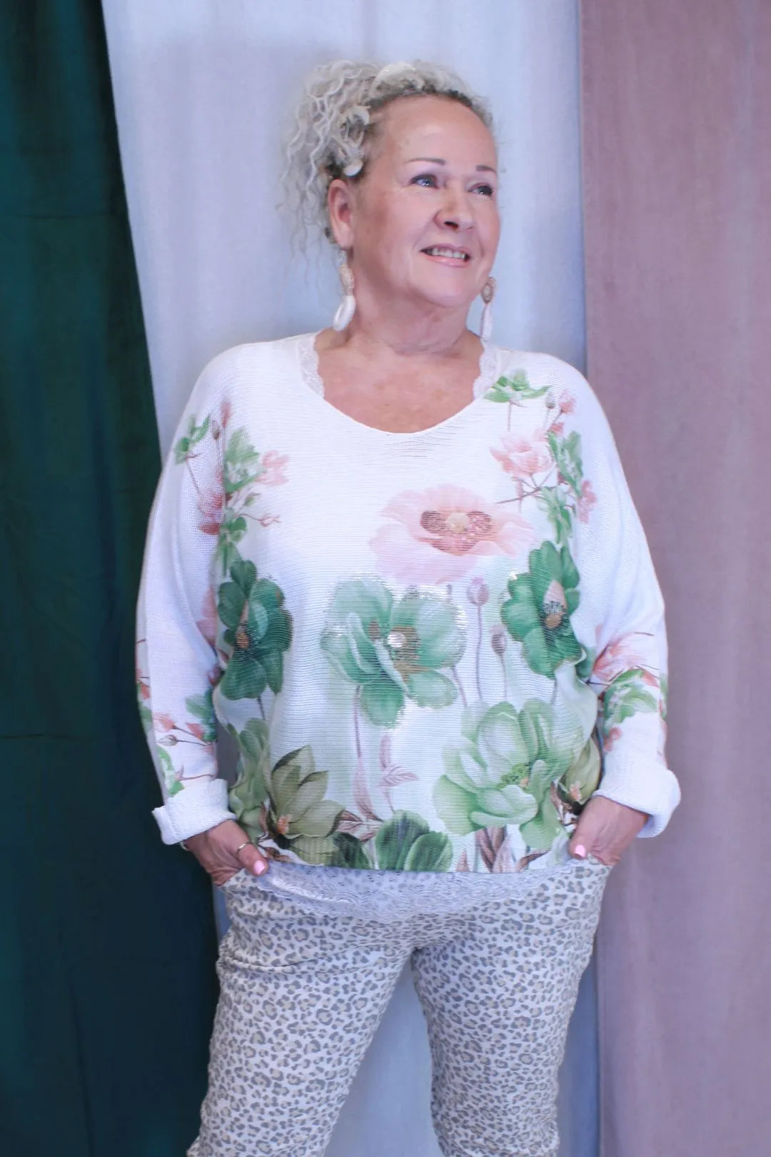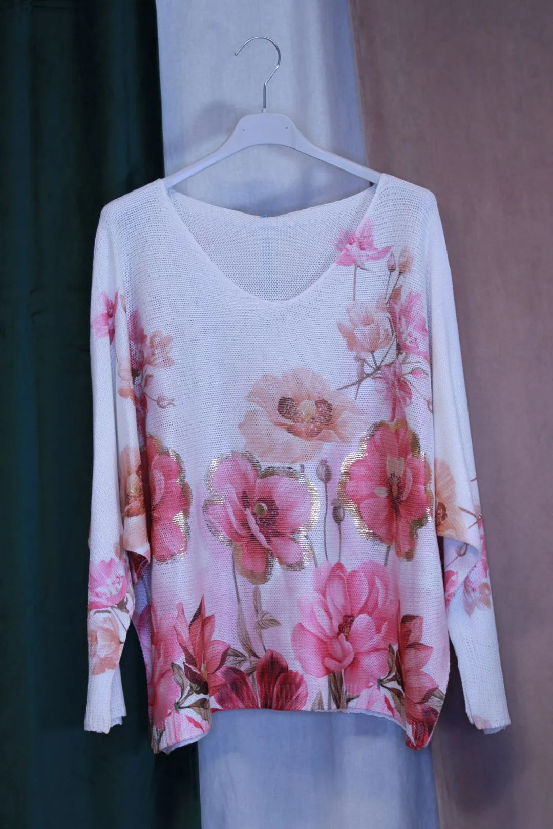 Kaunis kukkaprintti tuo ilmeeseen naisellisuutta ja tekee neuleesta helposti yhdisteltävän niin farkkuihin kuin vaaleisiin housuihin.