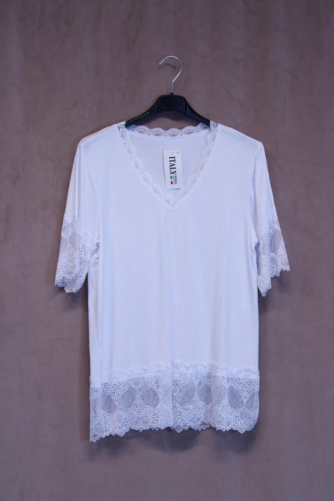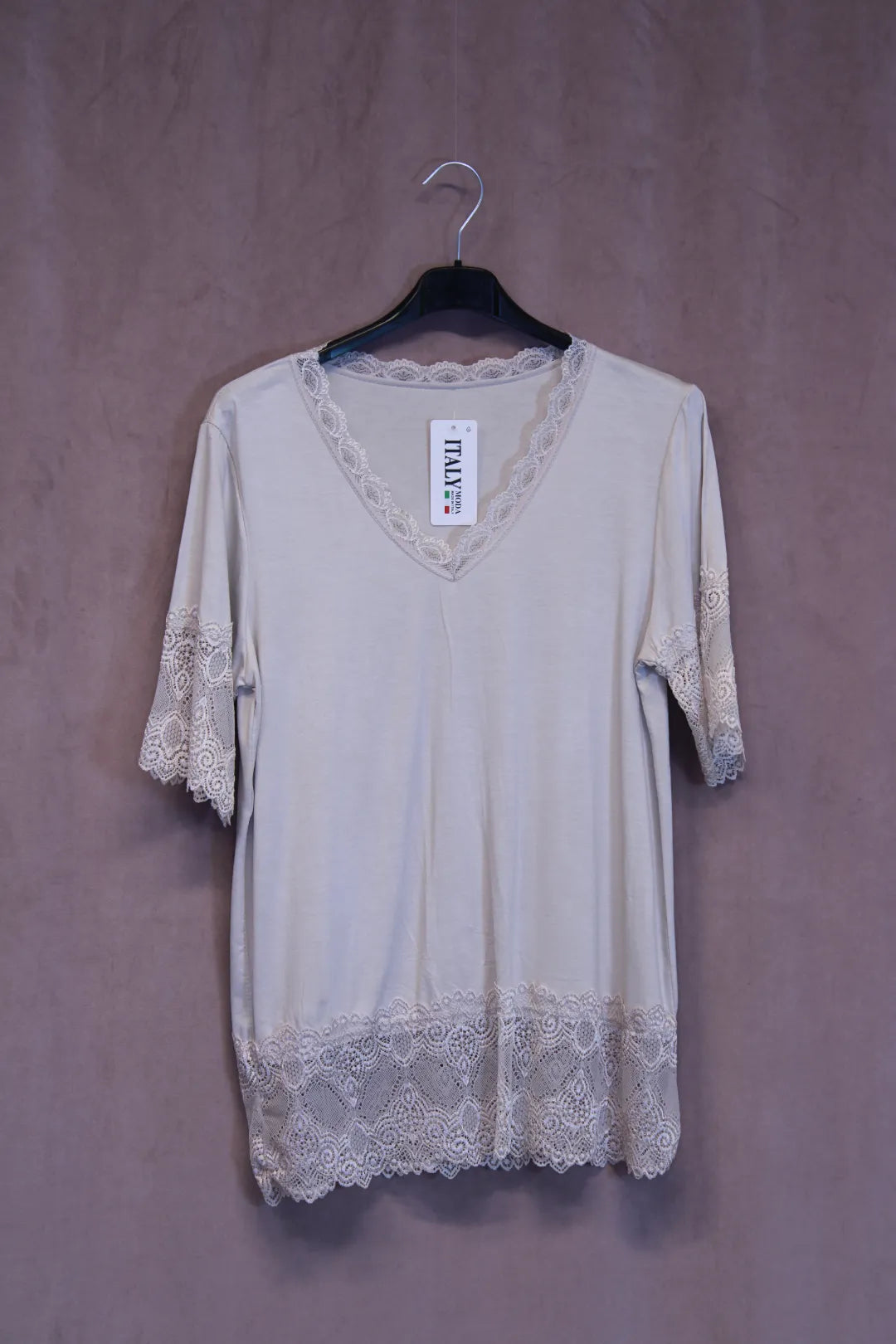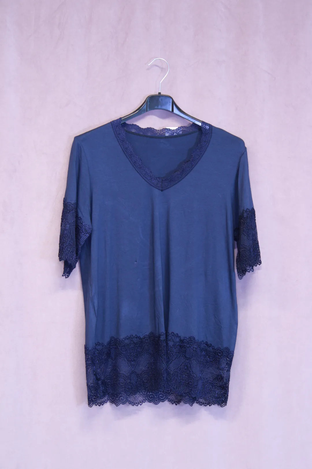 Kaunis t-paita mallinen pukeutumispaita. Hihat ovat pitsiä, myös helmassa ja kaula-aukolla pitsikoristukset.