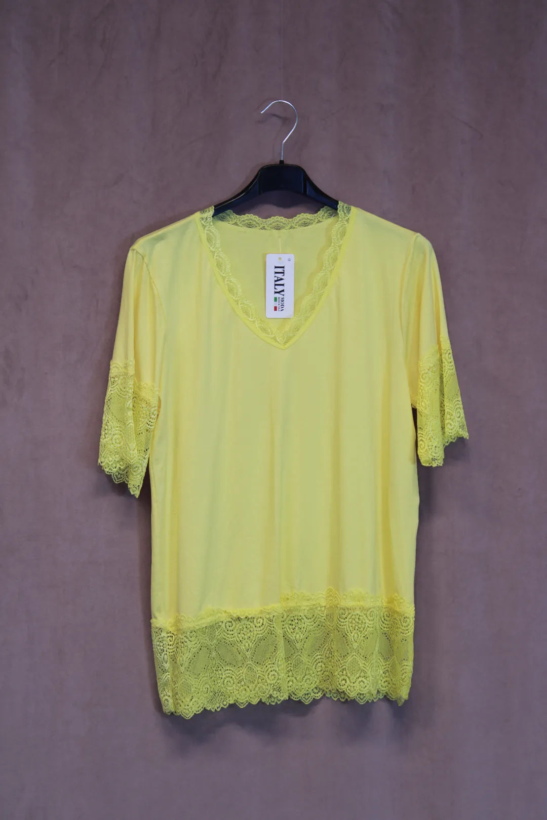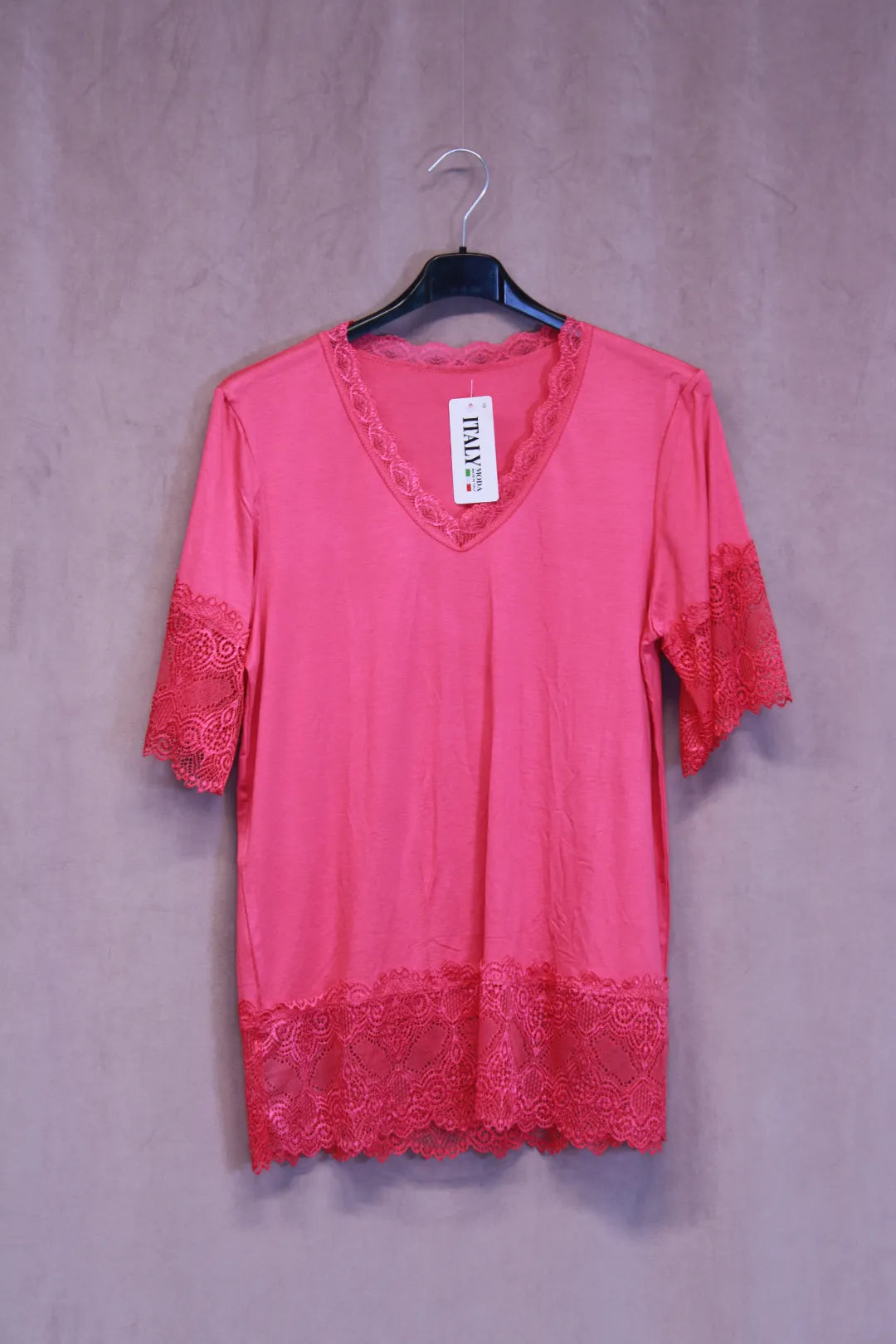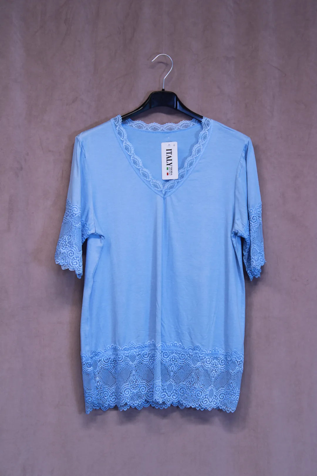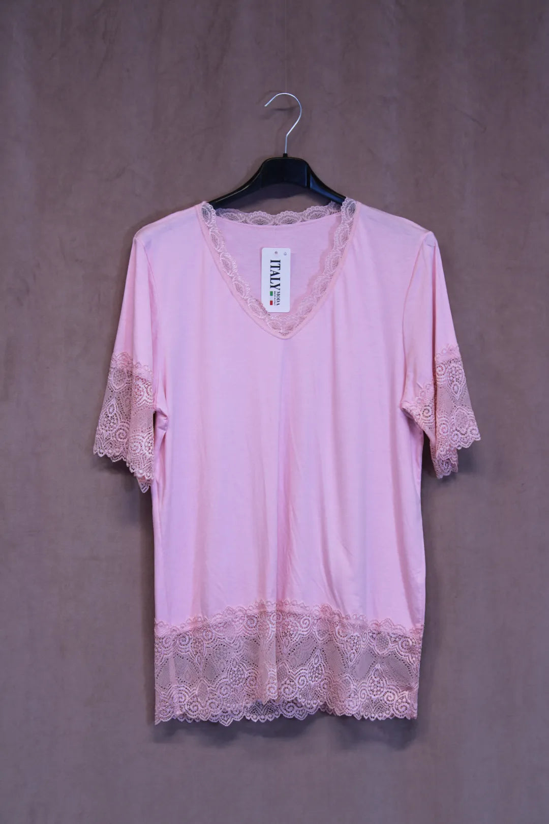 Kaunis t-paita mallinen pukeutumispaita. Hihat ovat pitsiä, myös helmassa ja kaula-aukolla pitsikoristukset.