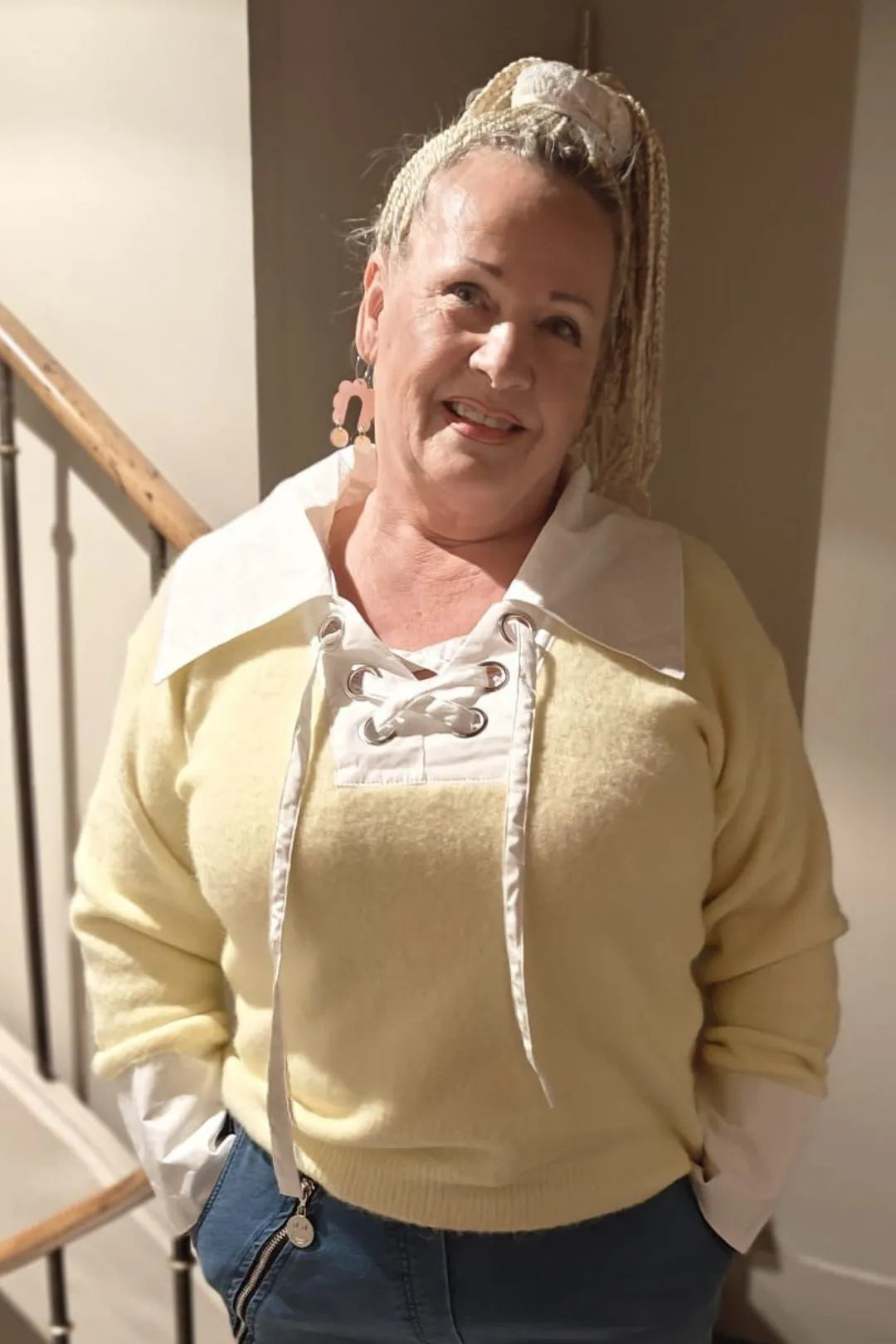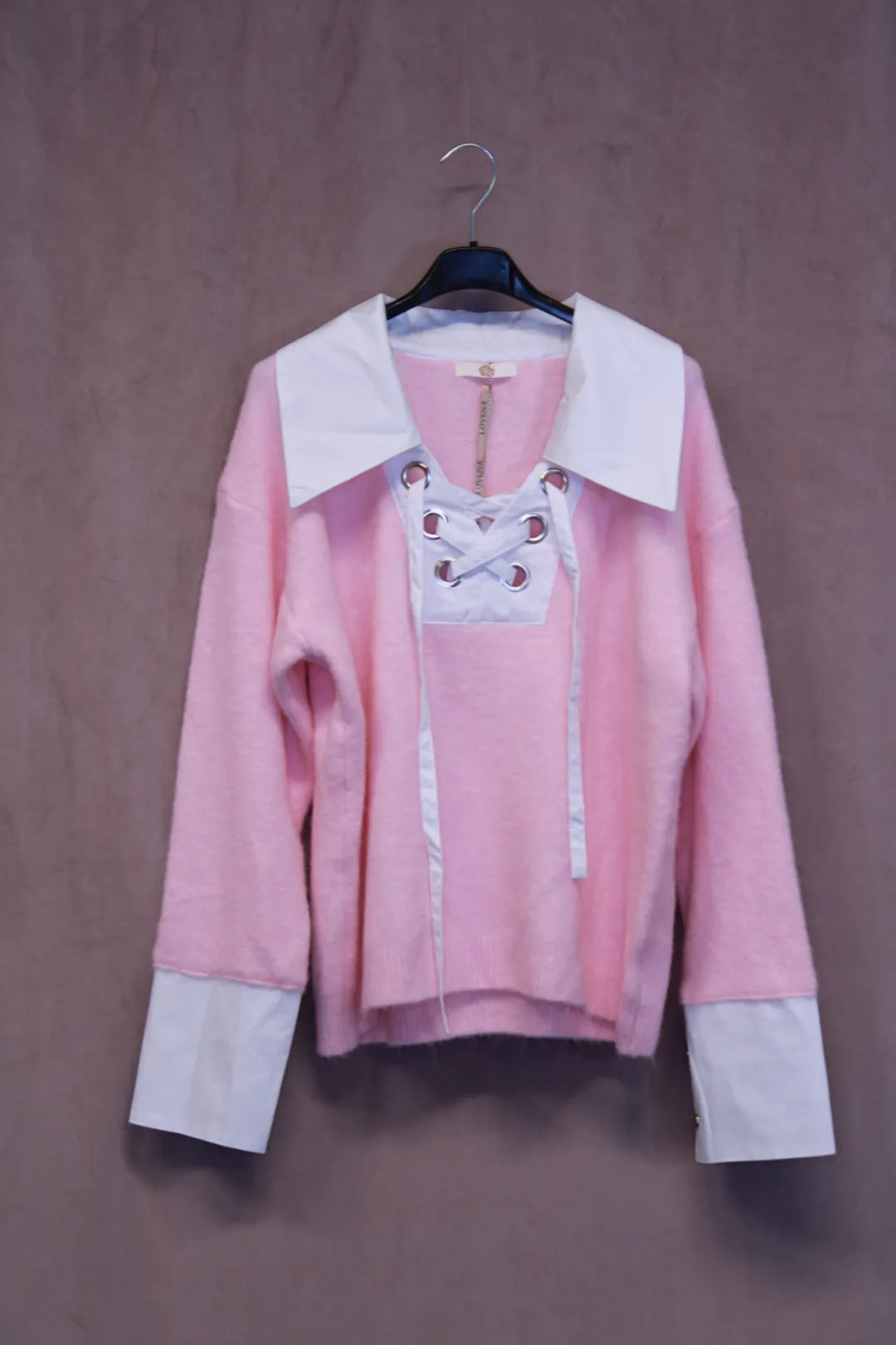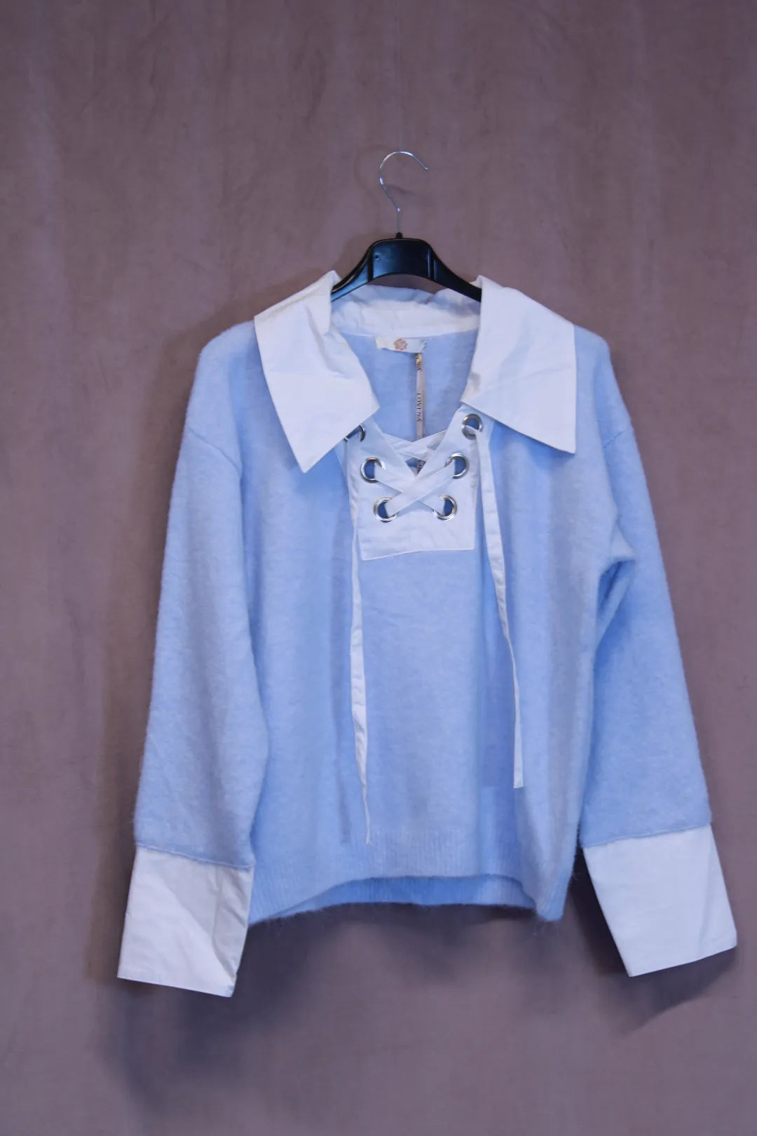 Kaunis neule, jossa yksityiskohtana kaulukset ja nauhat kaula-aukolla. Myös hihansuissa kauluspaita yksityiskohdat.