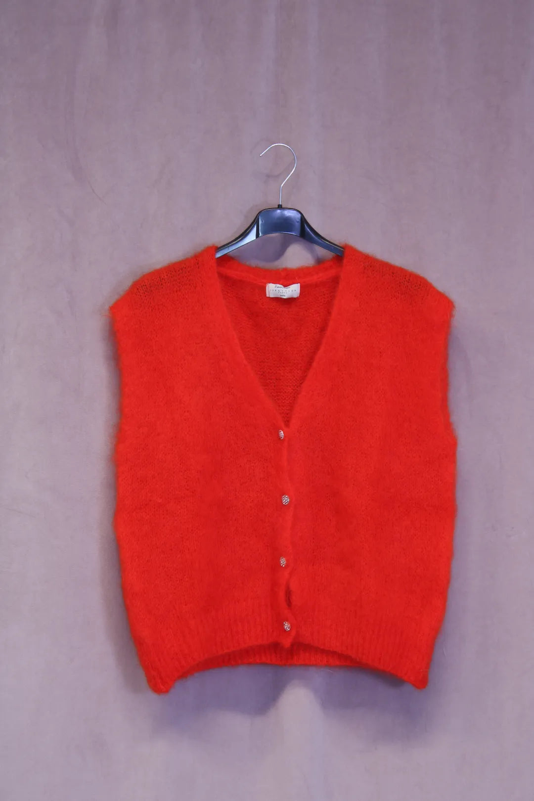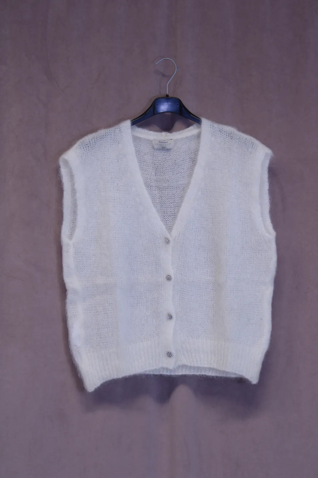 Pehmeä, hihaton neule. Edessä upeasti kimaltavat pienet timanttinapit.