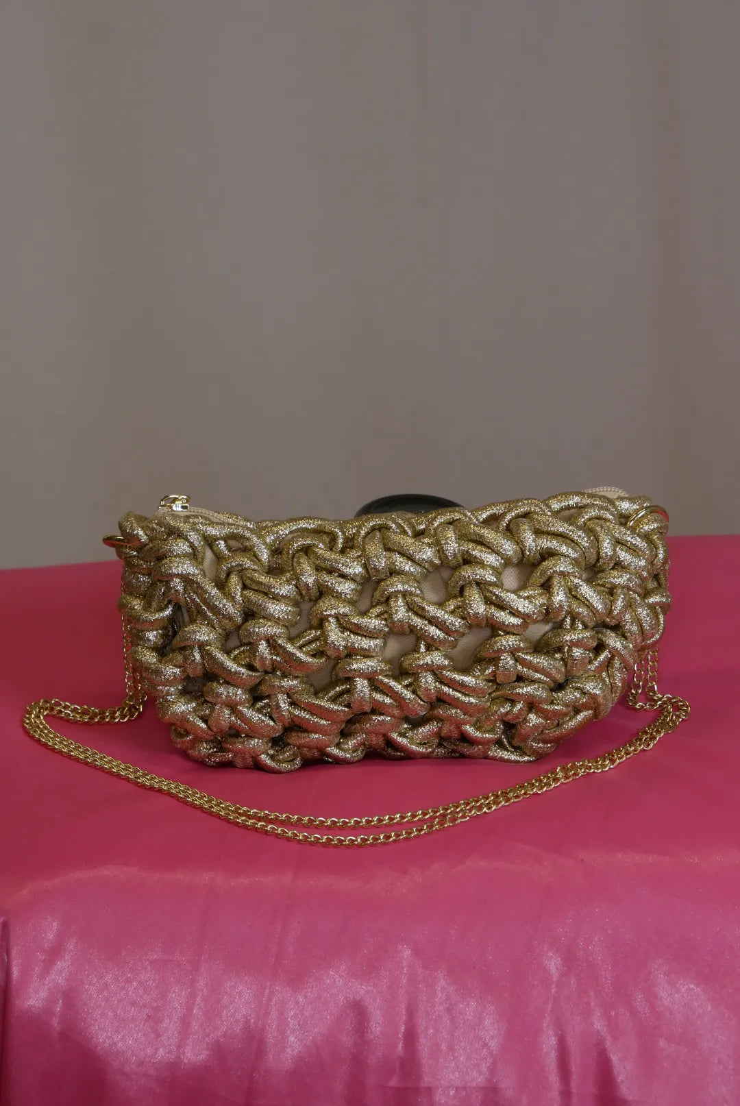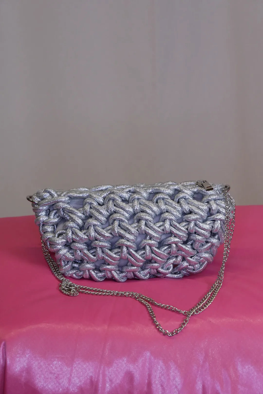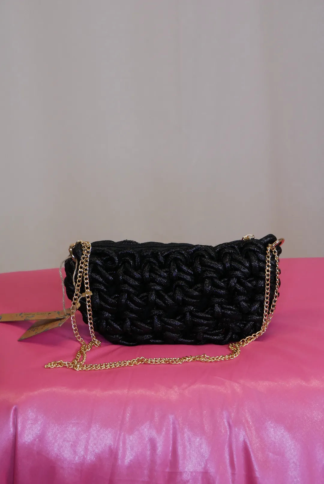 Upea kimaltava pikkulaukku, kankaisella solmupäällisellä. Vetoketjukiinnitys, ketjua voi käyttää käsilaukkuna kaksinkerroin tai yksinkerroin olkahihnana. Kaksinkerroin hihnan pituus 65cm yksinkerroin 106cm.