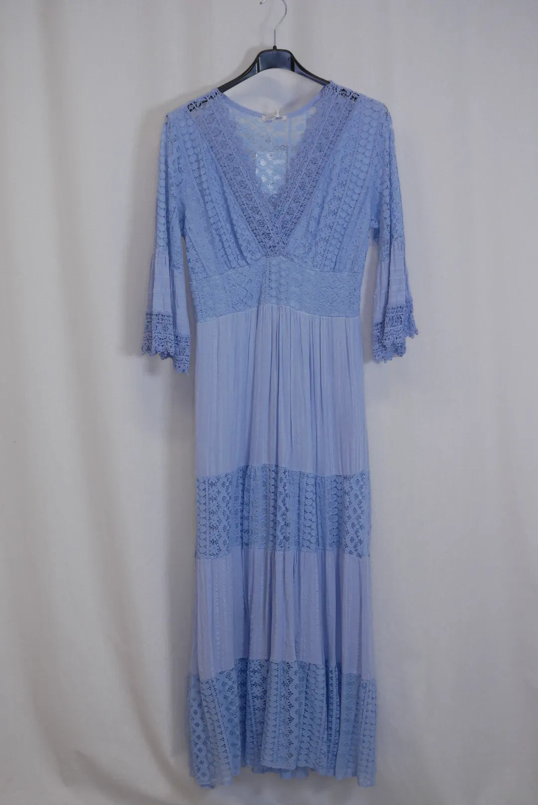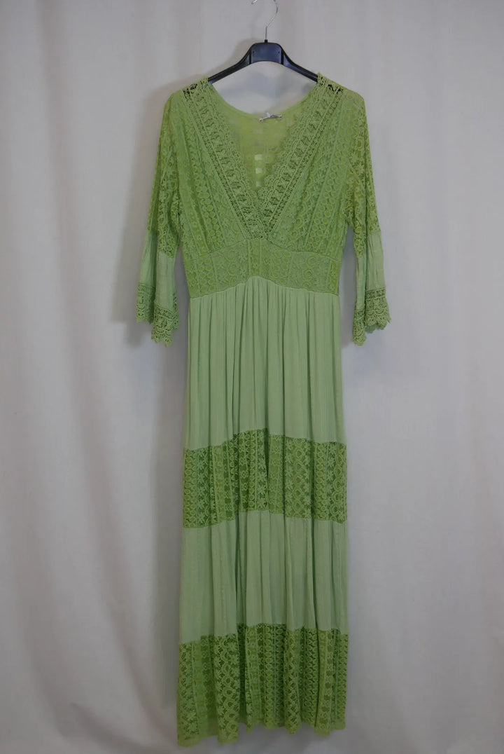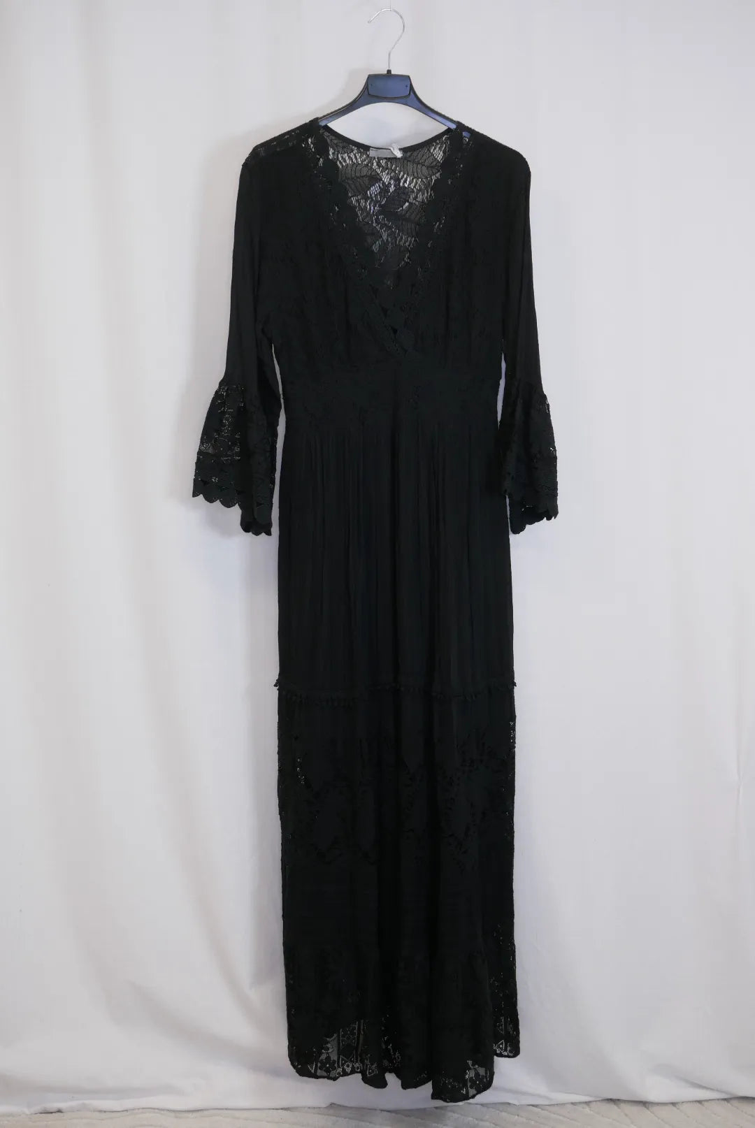 Kaunis ja juhlava pitkä pitsimekko hihafrilloilla. One size koko. Made in Italy.