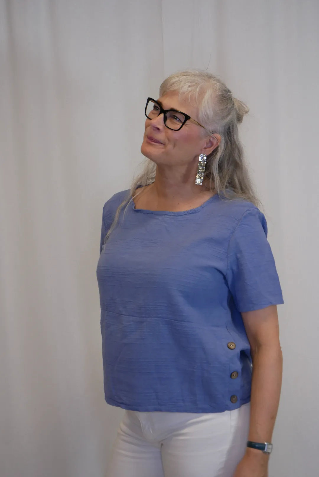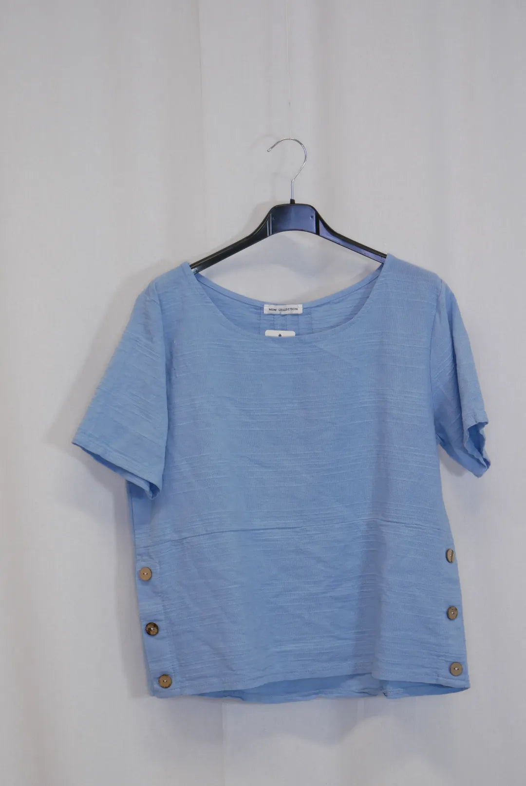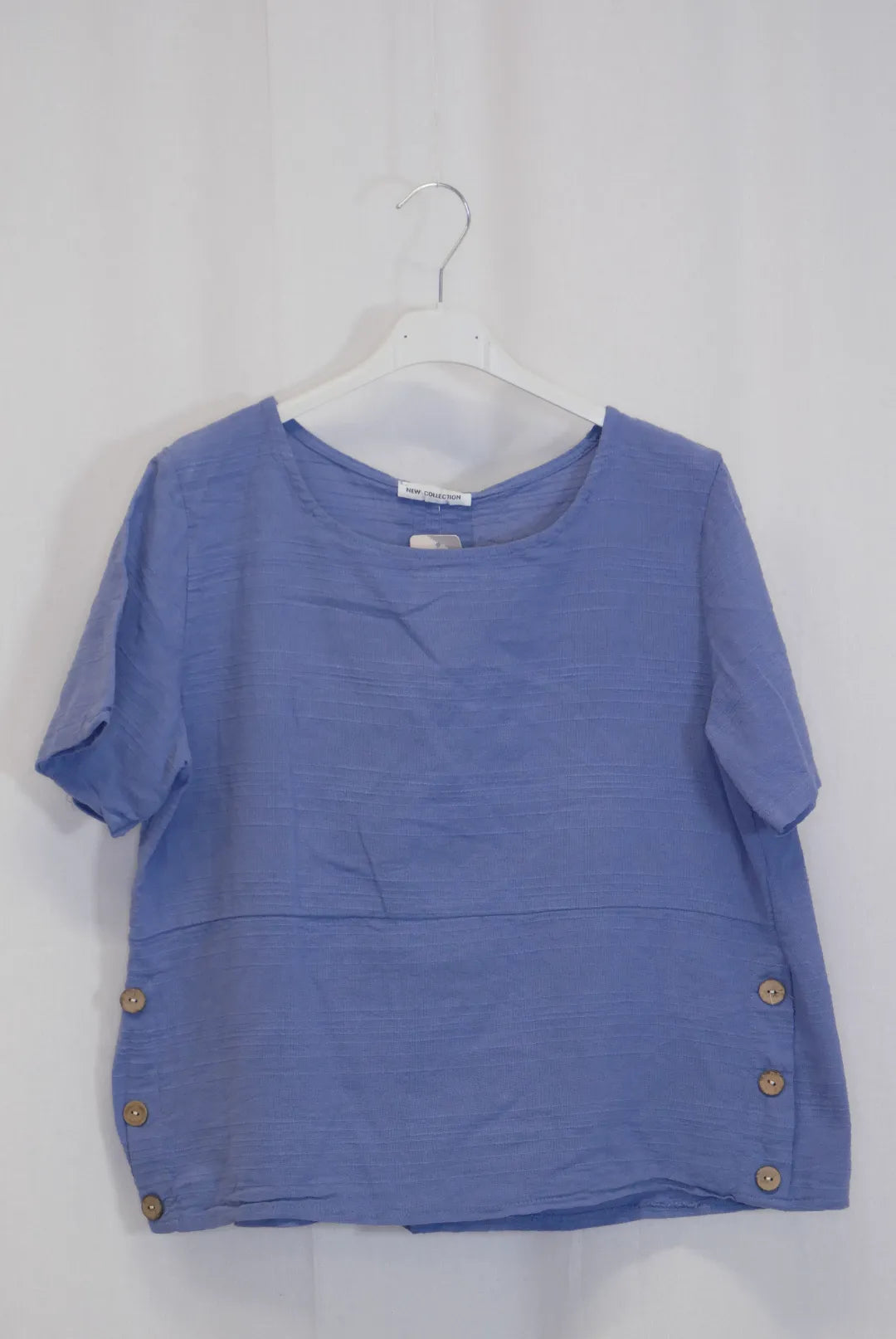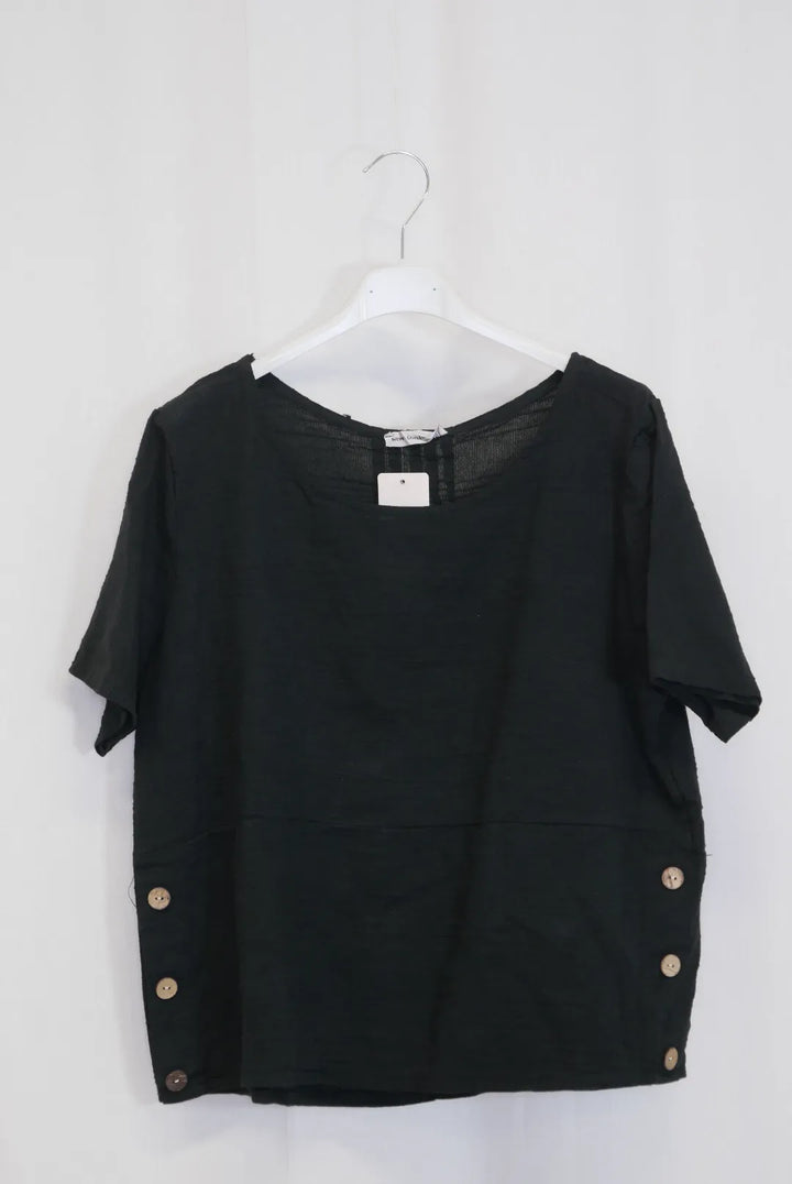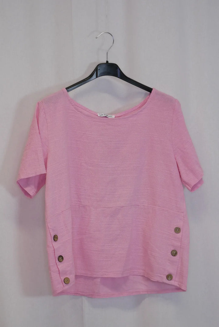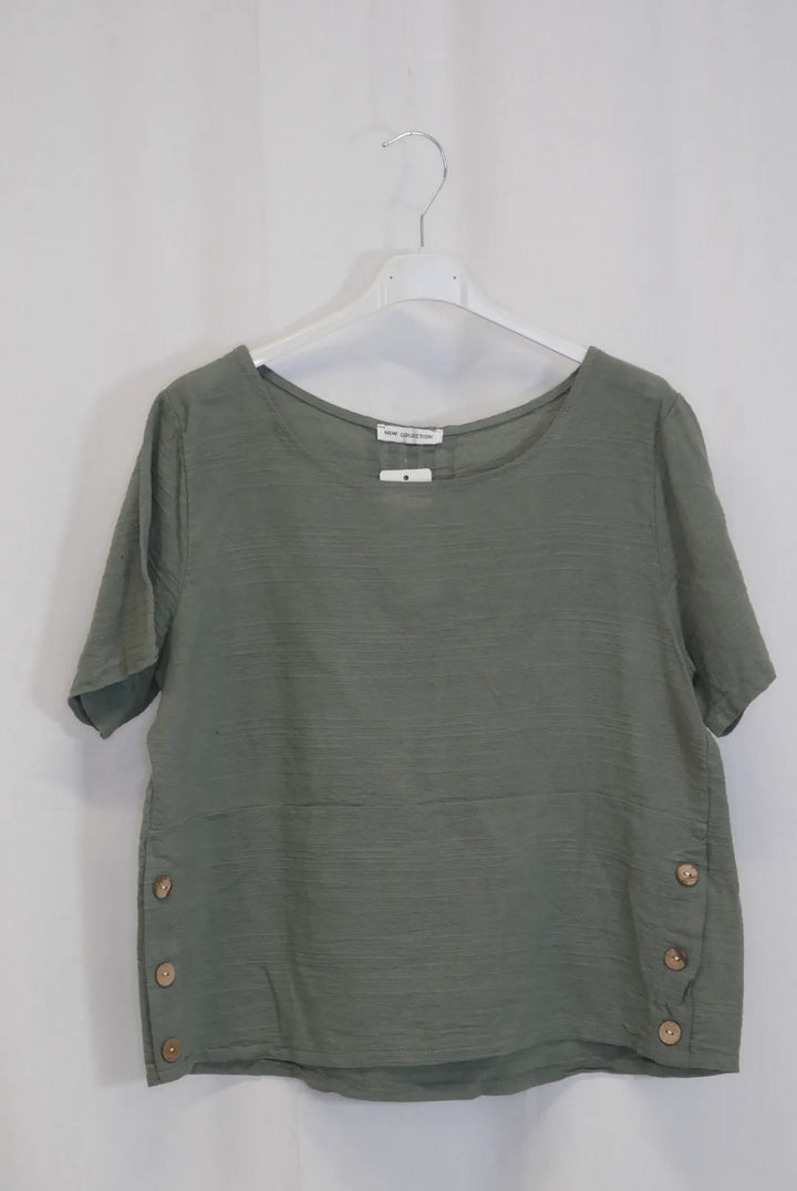 Lyhyen mallinen lyhythihainen paita, sivuilla koristenapit. Puuvilla on ihanan hengittävä ja kevyt luonnonmateriaali, ei jousta.