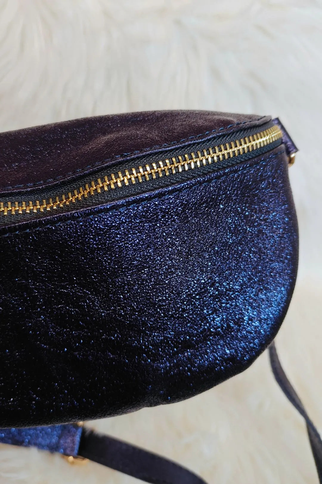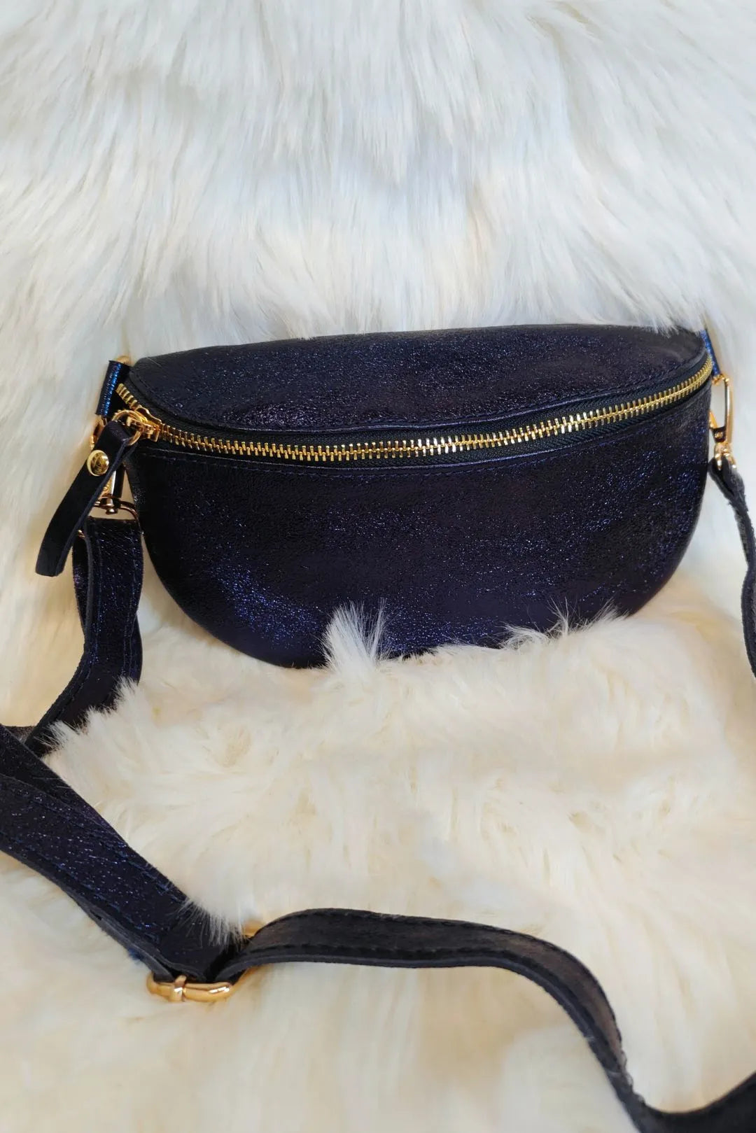Kimaltava tummansininen vyölaukku. Säädettävä olkahihna.