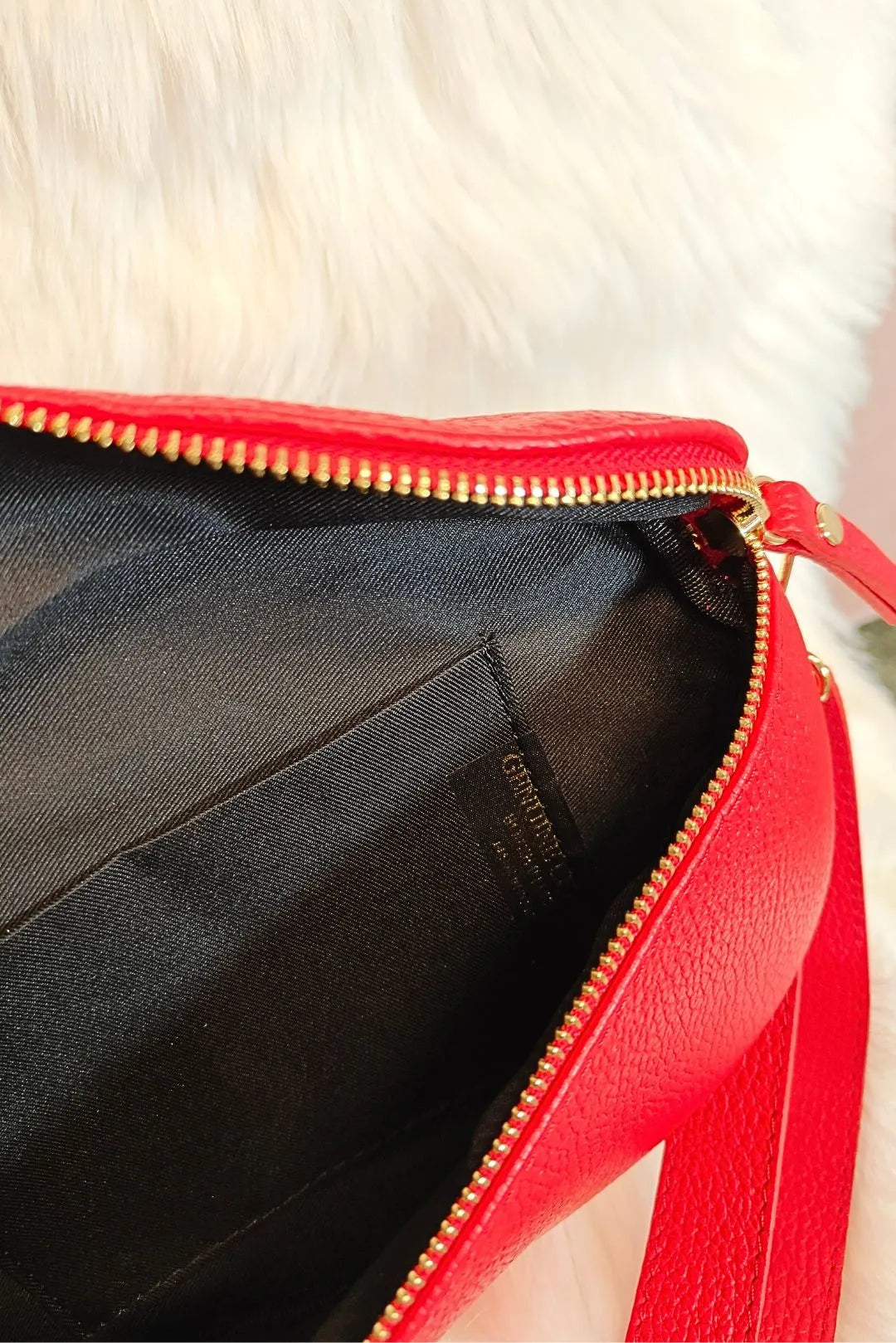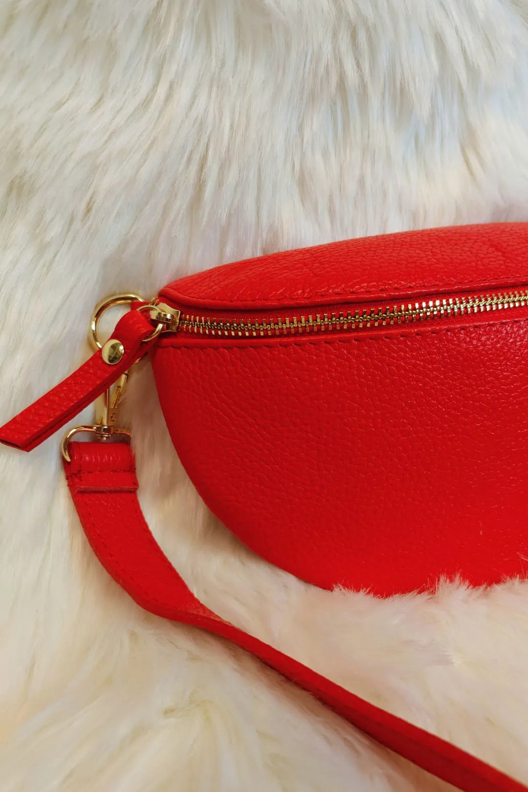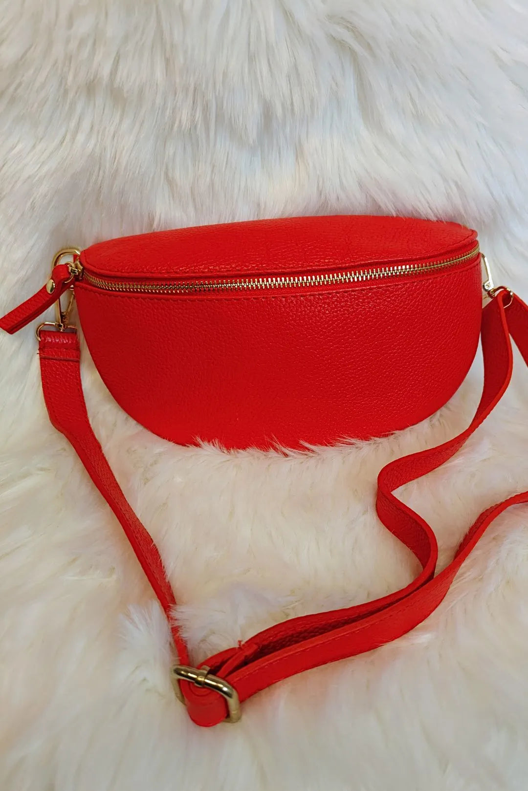 Kimaltava punainen vyölaukku. Säädettävä olkahihna.